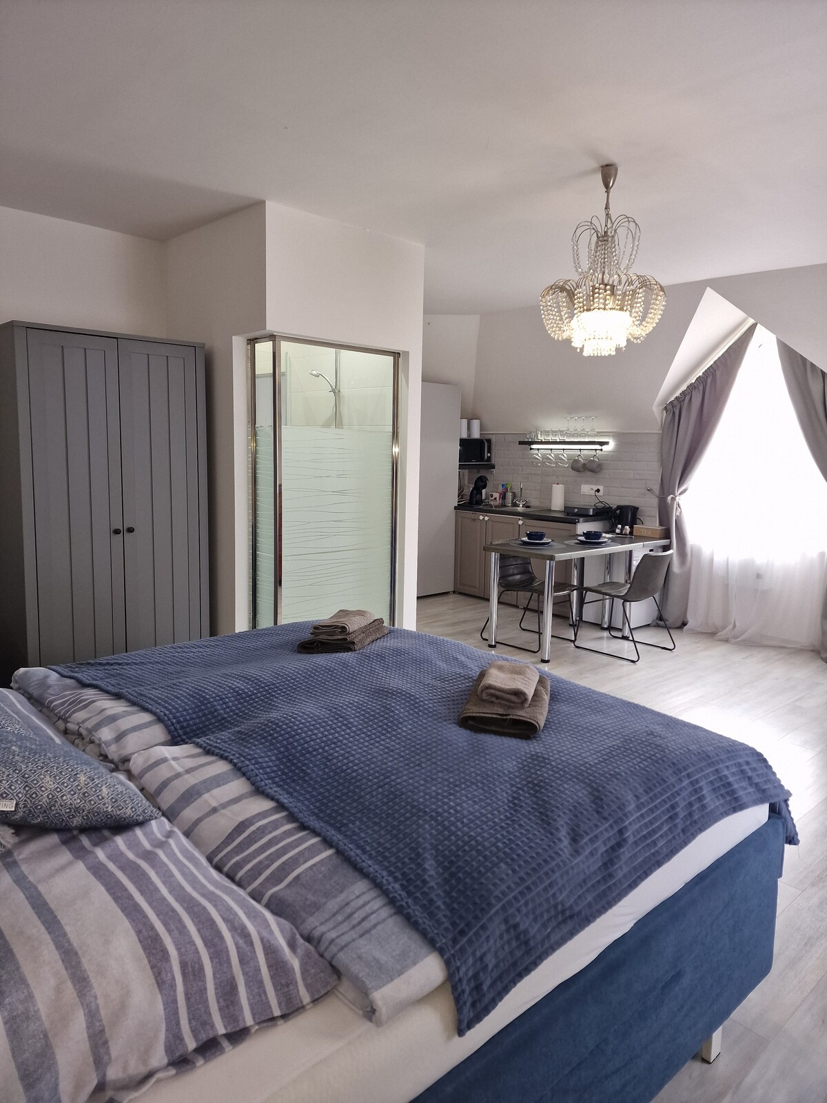 Akomodasi unik ini memiliki gayanya sendiri. 5 menit dari pusat, 2 menit dari taman hutan. Di rumah keluarga dengan pintu masuk pribadi. Lingkungan yang tenang, tepat di tengah - tengah Trenčín. Studio dengan double bed/dua single bed, dengan opsi dua extra bed dengan biaya tambahan. 2+2 - Tempat tidur double ditambah dua tempat tidur single Shower dengan view kamar. Dapur kecil (piring panas, microwave, ketel listrik, kulkas) Kamar mandi pribadi, pintu masuk terpisah, parkir gratis.