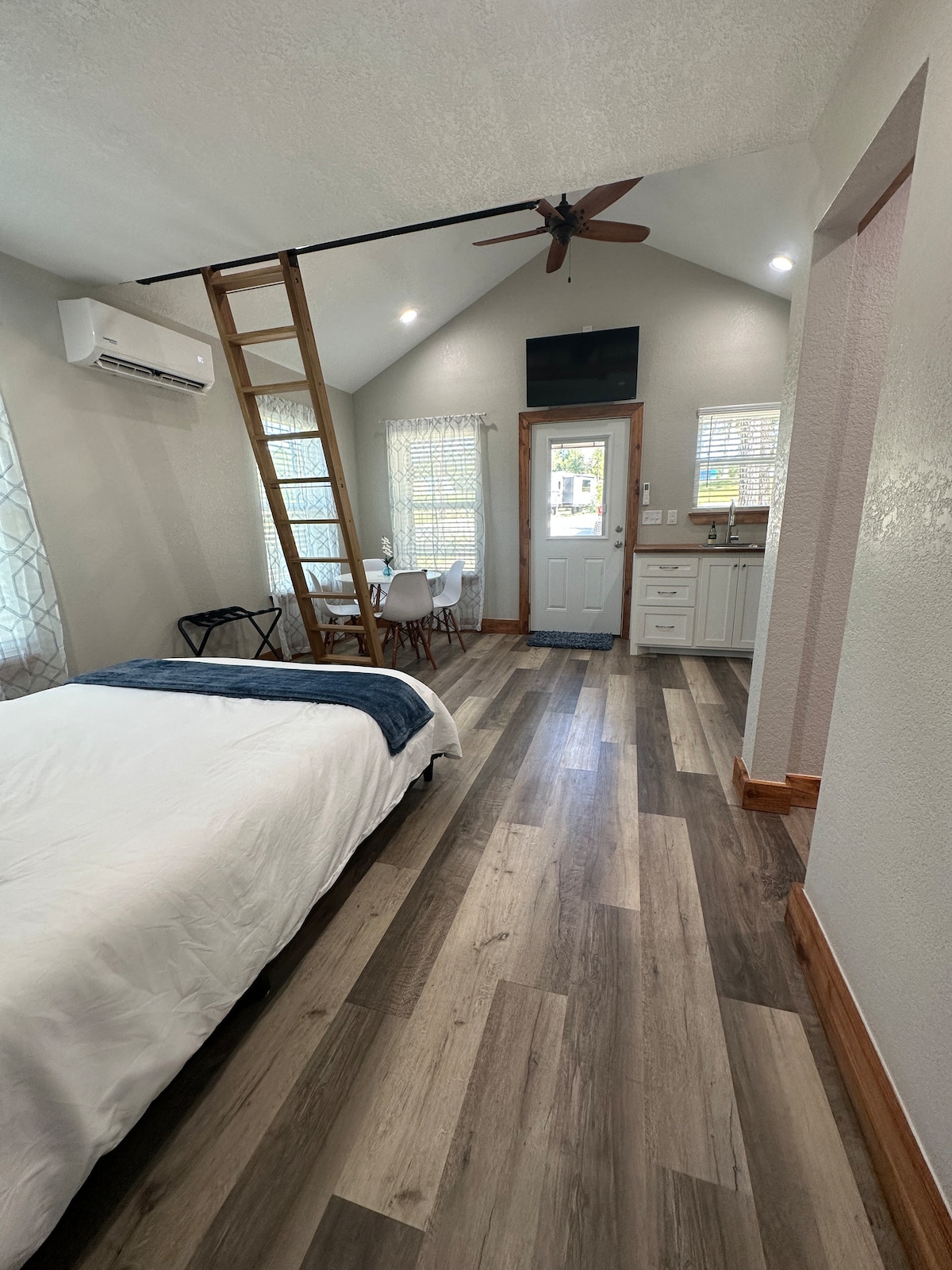 Satu kamar tidur, satu kamar mandi dengan pintu masuk pribadi dan tempat parkir yang aman. Apartemen studio berbagi dinding dengan rumah tuan rumah dan memiliki pintu masuk tangga sendiri dengan kunci pintu keypad, foyer, kamar tidur berjendela yang luas, lemari besar, AC dan unit pemanas mini-split baru dengan remote control, TV, kamar mandi lengkap dengan shower. Kulkas tersedia untuk digunakan tamu. 1/4 mil ke Main Street, toko, restoran. Perhatikan bahwa properti ini memiliki unit Airbnb lain yang berdekatan, kontainer pengiriman yang dikonversi dengan 2 tempat tidur, kamar mandi.