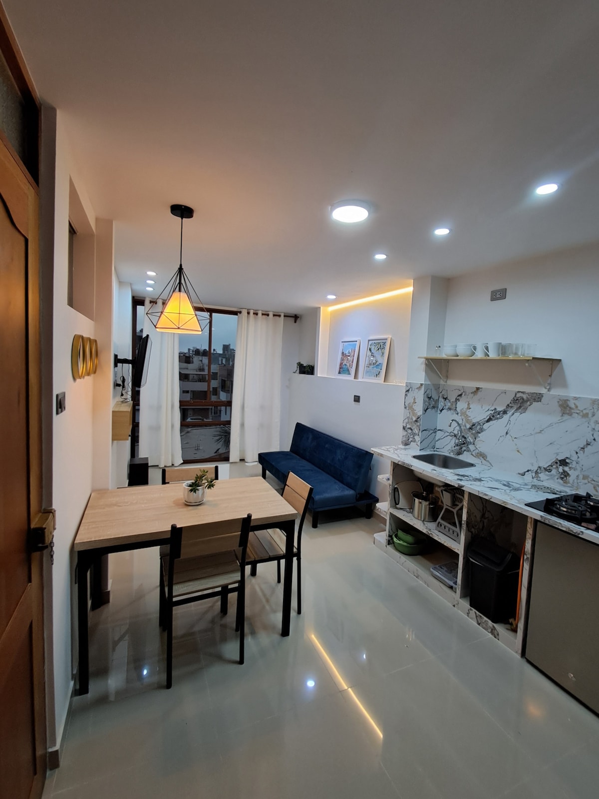 ✅ 2 habitaciones: principal con cama doble y mural artístico, secundaria con cama de 1.5 plazas y vista despejada. ✅ Sala moderna y luminosa: TV, sofá y murales que inspiran relajación. ✅ Comedor para 4 con mural floral. ✅ Cocina equipada con refrigeradora, microondas, cafetera, hervidor y utensilios. ✅ Baño estilo spa con ducha de vidrio, luz LED y detalles en madera. ✅ Ventanales amplios de luz natural. ✅ Ubicación estratégica: a minutos del centro, cerca de restaurantes, cafés y tiendas.