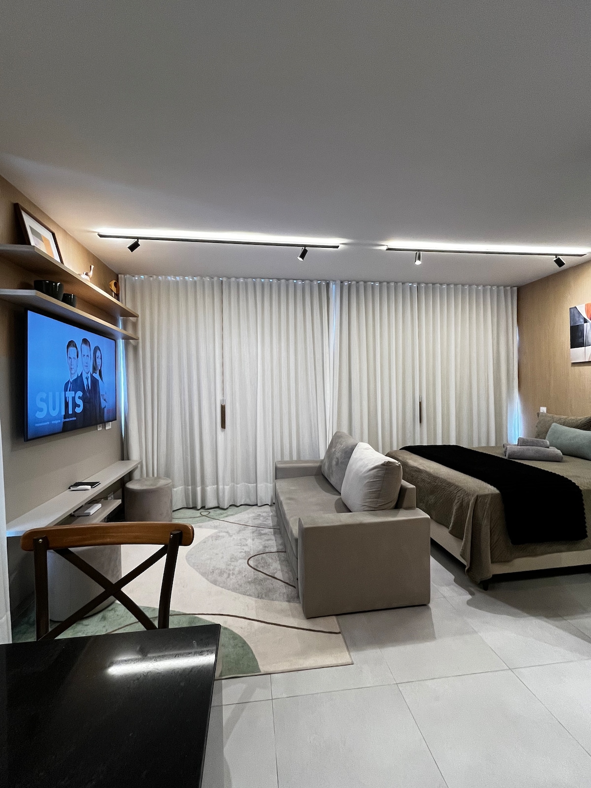 Loteng unik di kota! Balkon gourmet tertutup dan ber-AC, dengan meja dan kursi untuk Anda menikmati barbeku! Kamar tidur dengan tempat tidur berukuran queen dengan lingkungan ruang tamu terpisah yang menjaga privasi Anda. Ruang tamu dengan sofa bed, Smart TV dan AC. Dapur lengkap untuk persiapan makanan Anda. Tempat Tidur dan Mandi Enxoval Lengkap. Ruang garasi ganda. Datang dan rasakan seperti rumah Anda sendiri!