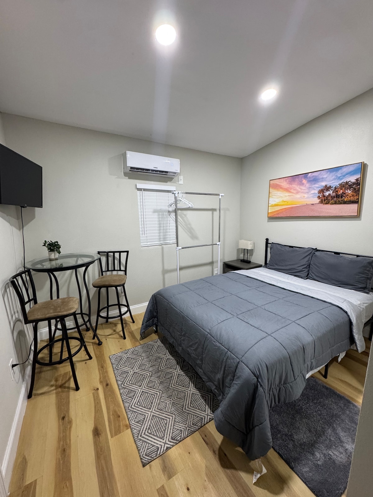Ruang untuk 2 orang. Studio pribadi, pintu masuk pribadi, tempat parkir di depan. Dilarang merokok di studio. Pancuran pribadi besar dengan pelembut, kepala yang bisa dilepas, tempat tidur KING, tv berwarna, kabel ,wifi. Meja yang cukup besar untuk digunakan untuk bisnis, microwave, pembuat kopi, pemanggang roti, kulkas, meja rias, tempat penyimpanan gantung dan seprai yang disediakan. Ada area duduk di luar untuk merokok dan bersantai. Unit AC/Pemanas tambahan yang dipasang beserta unit sistem pusat standar rumah utama kami untuk menambah kenyamanan yang dikendalikan oleh Anda
