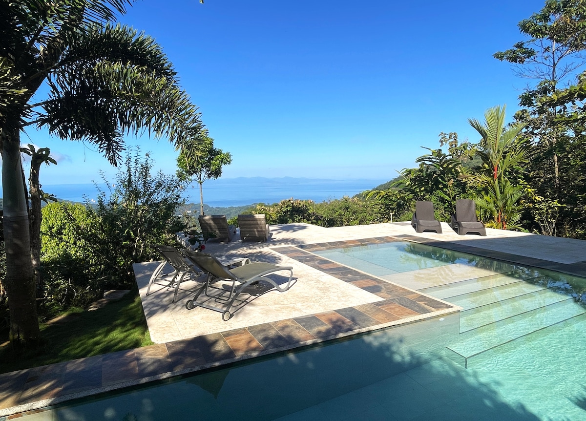 Menginaplah di puncak dunia di rumah hutan pribadi ini yang memiliki kolam renang 3 tingkat dan bak mandi air panas yang menakjubkan ditambah lokasi terpusat untuk petualangan tanpa batas. Pemandangannya mencakup seluruh ruang luar ruangan, Anda bisa melihat Carara sampai ke Manuel Antonio. 3 suite utama dengan total 9 tempat tidur. Terasa seperti satu juta mil jauhnya tetapi hanya 15 -20 menit ke pusat Jaco dan pantai termasuk Hermosa dan Herradura. 1 jam ke Taman Nasional Manuel Antonio dan 1,5 menit dari bandara internasional di San Jose.