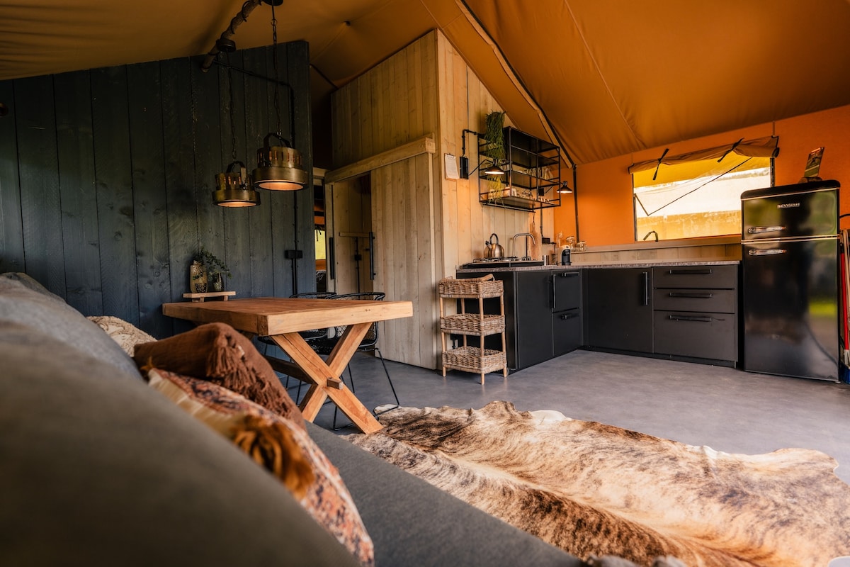Di bawah pepohonan kuno di lanskap yang indah, ada tenda kapas besar yang terletak di teras kayu besar, dengan pemandangan menakjubkan. Tenda memiliki ketinggian 5 meter dan dilengkapi tempat tidur untuk 2 orang, 2 tempat tidur single (jika diperlukan), karpet di lantai, listrik dan air. Tenda ini dijamin tahan air dan ketebalan kanvas menawarkan perlindungan yang cukup terhadap angin. Di depan tenda terdapat teras besar dengan meja, kursi dan kursi dek.