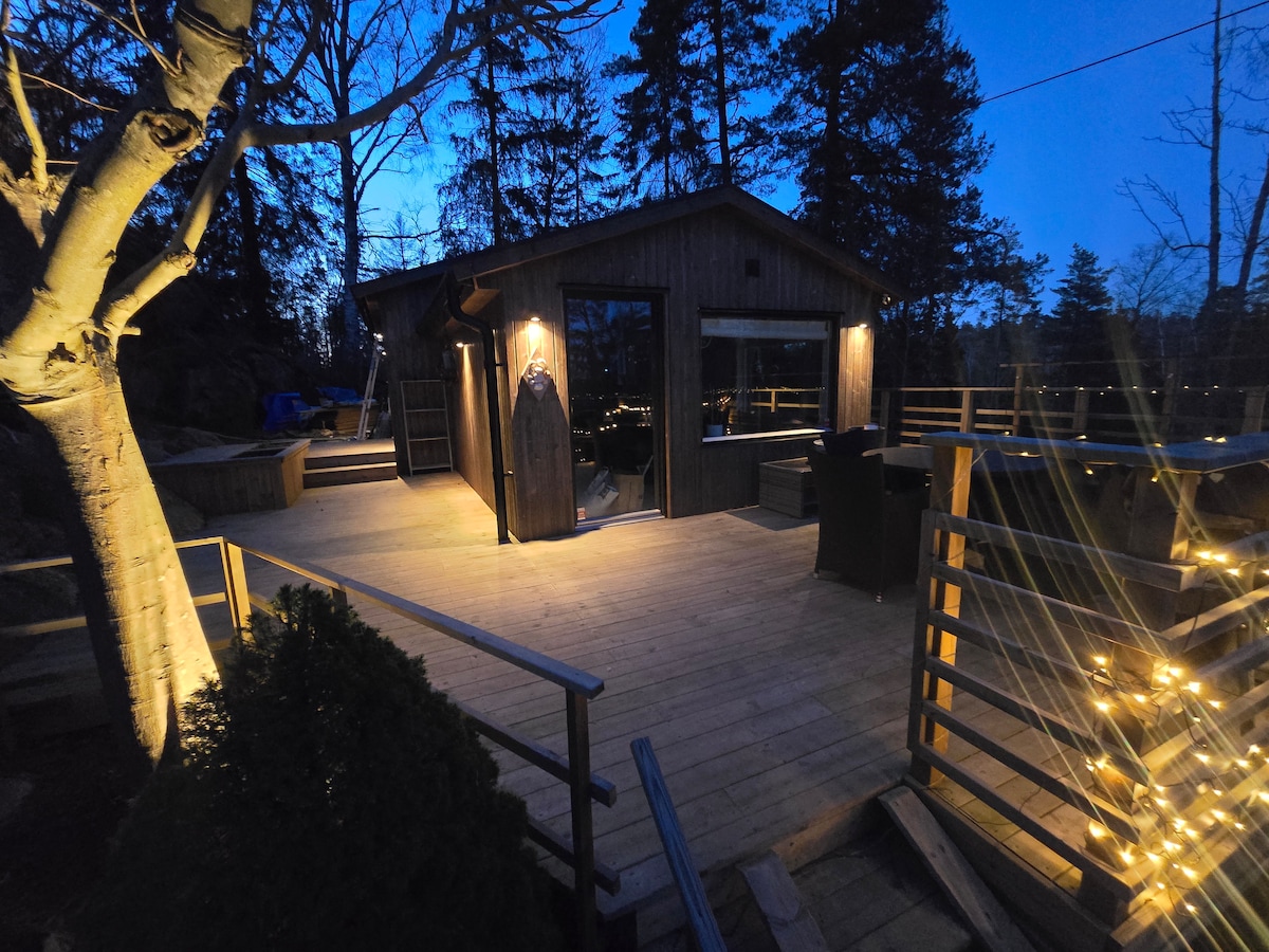 Guest house seluas 30 meter persegi di posisi tinggi di tengah semenanjung dengan berjalan kaki ke pemandian indah di laut dan danau. Di semenanjung terdapat beberapa cagar alam di mana hutan dan formasi batuan yang dramatis menawarkan sudut pandang dan hiking yang indah. Alam dan keheningan menjadikan tempat ini sangat santai. Stockholm dicapai dalam 30 menit dengan mobil, dengan bus dalam 60 menit. Di bagian depan terdapat dek dan taman yang memberikan privasi pada bangunan utama. Di bagian belakang terdapat teras yang baru dibangun yang menghadap ke hutan.