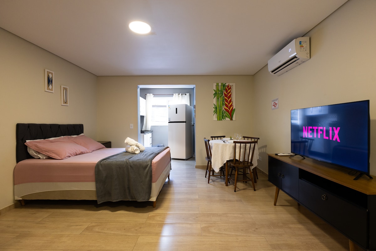 Studio Ubatuba yang Nyaman. Kolam Renang, Garasi, dan Tempat Tidur Queen