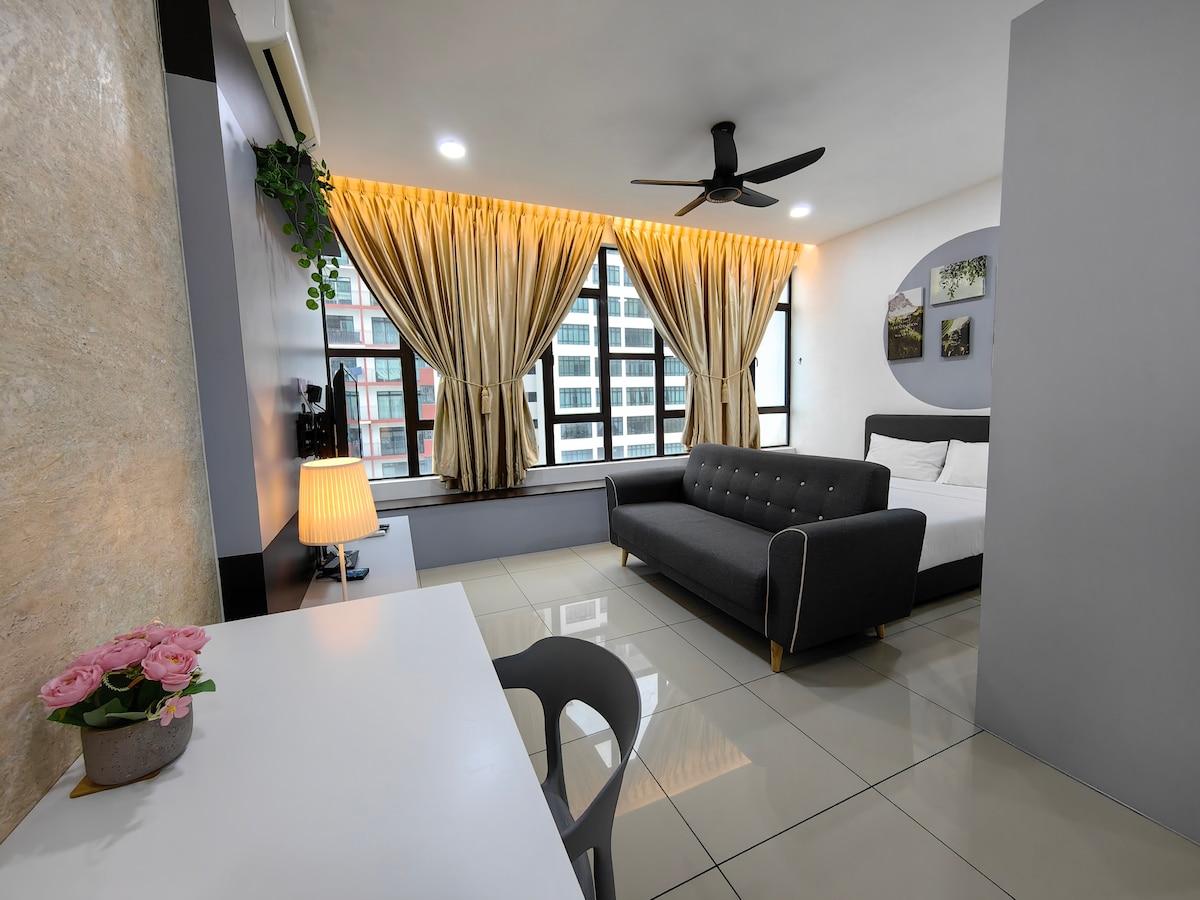 (1+1 BR & 1 kamar mandi) Kondominium modern dan nyaman kontemporer di pusat kota JB. Cocok untuk 4pax keluarga, teman dan grup bisnis. **5 menit ke CIQ, City Square, KSL, Pelangi, dan Larkin **8 menit ke Mid Valley Southkey, Larkin Sentral, dan Sentosa **15 menit berkendara ke pusat perbelanjaan Paradigm, Sutera, Skudai, dan Mount Austin ✔ 4K SmartTV Wi - Fi Kecepatan✔ Tinggi, meja kerja dengan steker ekstensi ✔ Mesin pencuci ✔ Aircond di setiap kamar. Konsol ✔ Atari, Mahjong, dan permainan papan. ✔ PARKIR GRATIS untuk 1 mobil