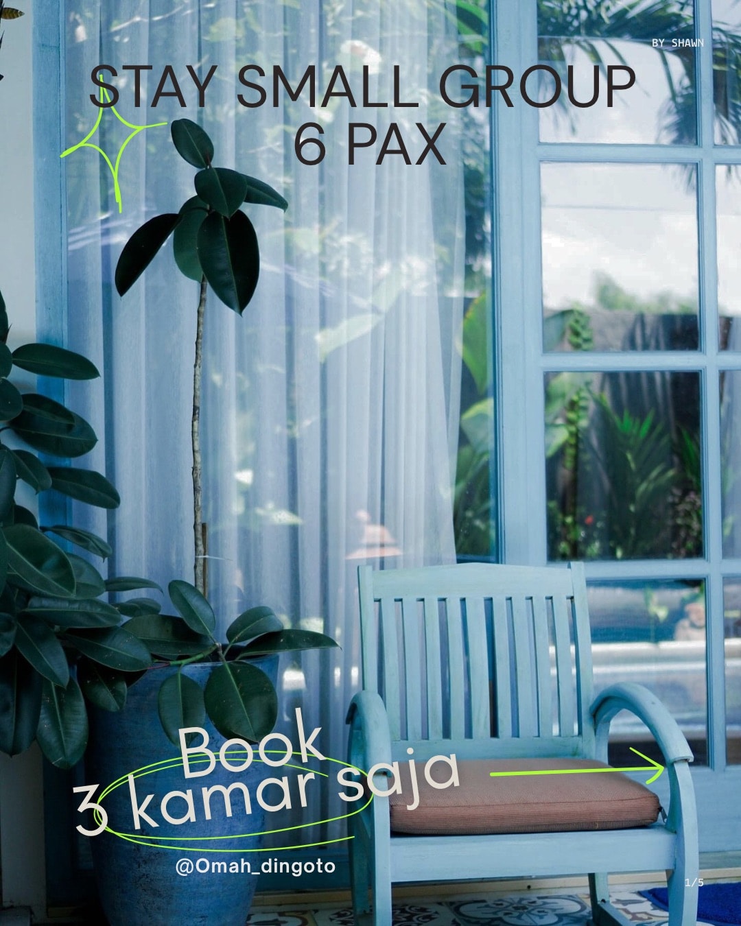 Rumah di tengah perkampungan bergaya minimalis dengan ruang terbuka hijau dengan 4 kamar tidur. Semua kamar ada AC dan guling. 3 kamar dengan kasur berukuran 140x200, dan 1 dengan kasur berukuran 120x200. Tersedia parkir motor, dan parkir muat 2 mobil. Wifi berkecepatan 50kbps, tv di ruang tengah yang dilengkapi dengan Netflix. Ruang bersantai antara lain; Lounge kecil di dapur dengan beanbags, Bar yg langsung menyatu dengan dapur dan meja makan outdoor untuk smoking area.