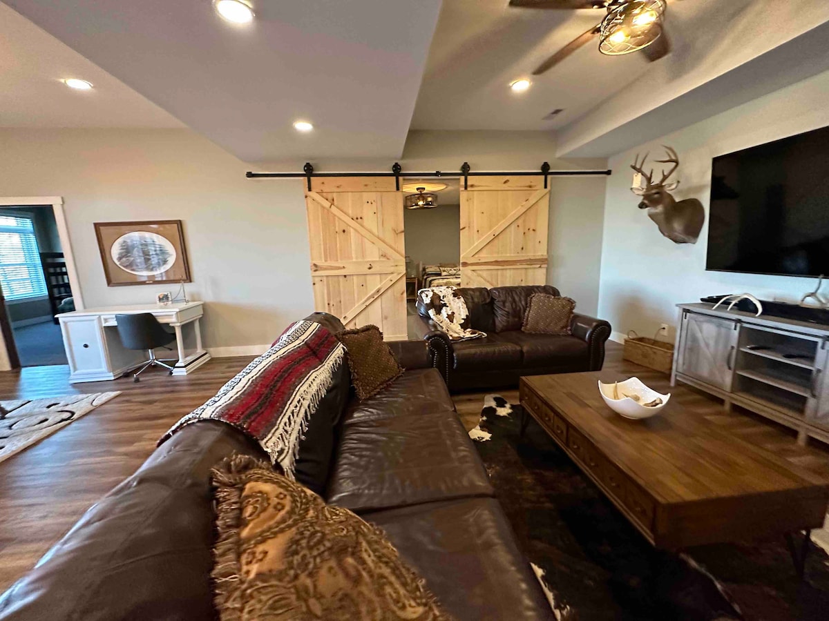 Guesthouse yang unik dan tertata apik ini adalah ruang bawah tanah pribadi yang terhubung dengan rumah kami. Selesai seperti apartemen besar/guesthouse dan tamu bisa datang dan pergi melalui pintu masuk pribadi mereka sendiri. Di belakang Anda akan menemukan area pemanggang, perapian, bak mandi air panas & danau. Interiornya memiliki 2 kamar tidur, kamar tamu, dapur , area makan, dan kamar mandi/laundry rm. Dekorasi seperti Lodge yang indah cocok untuk pemburu , kru kerja keliling, pasangan, keluarga kecil, dan lajang ! 1600sf