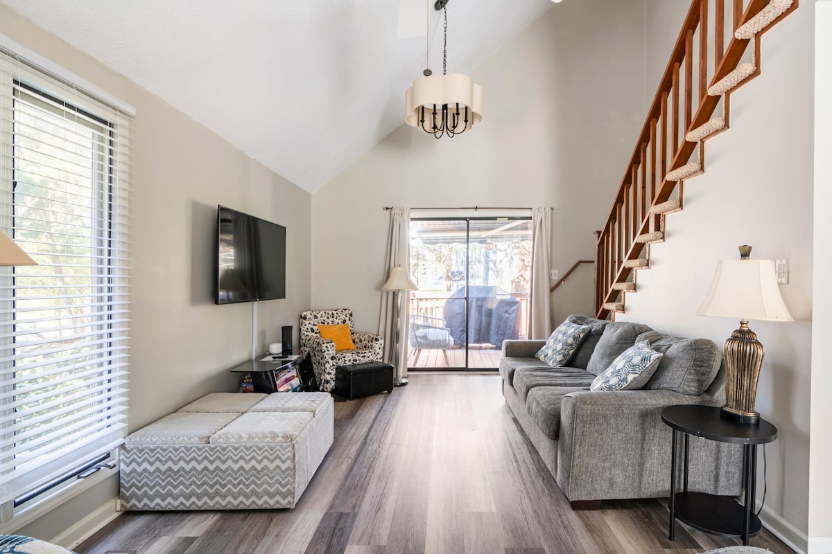 Temukan ketenangan kondominium berperabot lengkap kami, yang dirancang sempurna untuk tamu yang mencari kunjungan yang tenang ke Charlotte, NC. Terletak di jantung South Charlotte, properti kami berjarak sepelemparan batu dari Quail Hollow Country Club yang bergengsi dan 3 mil ke SouthPark Mall. Kamar kami yang luas dan diterangi matahari dirancang dengan apik. Lengkap dengan semua barang penting dan lebih banyak lagi! Mulailah pagi Anda dengan kenyamanan Starbucks tepat di sebelah sebelum mundur ke balkon pribadi Anda.