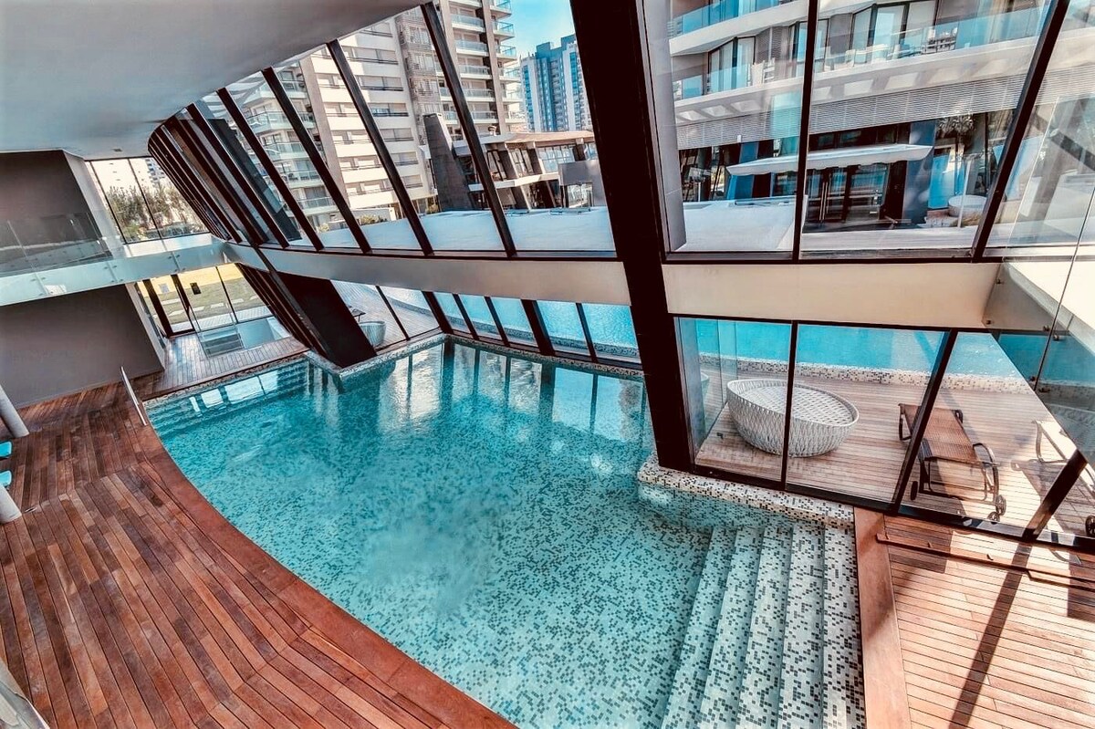 Apartemen cantik dengan pemandangan laut 120 meter dari pantai, 1 kamar tidur, kamar tamu, kamar mandi, dapur dan balkon, lengkap dan super nyaman. Gedung ini memiliki kolam renang berpemanas dalam ruangan dengan jacuzzi , pusat kebugaran, resepsionis, dua kolam renang luar ruangan dan barbekyu , barbekyu di teras dengan pemandangan pantai Mansa dan la Brava dan juga parkir. Di area yang penuh dengan restoran, pasar, dan banyak lagi. 😊