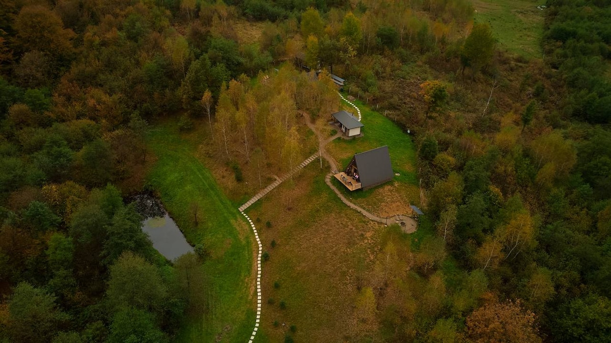 Dobrede adalah pondok segitiga yang nyaman di bawah hutan, di properti pribadi dengan danau, gazebo, dan area barbekyu. Di dekatnya terdapat anak sungai dan sungai, yang menambah pesona istimewa. Tersedia bak jacuzzi di lokasi dengan pra-pemesanan. Setiap pondok bisa menampung hingga 4 orang: di lantai dua terdapat tempat tidur double, di lantai satu terdapat sofa lipat. Pondok ini memiliki dapur lengkap yang memungkinkan Anda memasak sendiri.