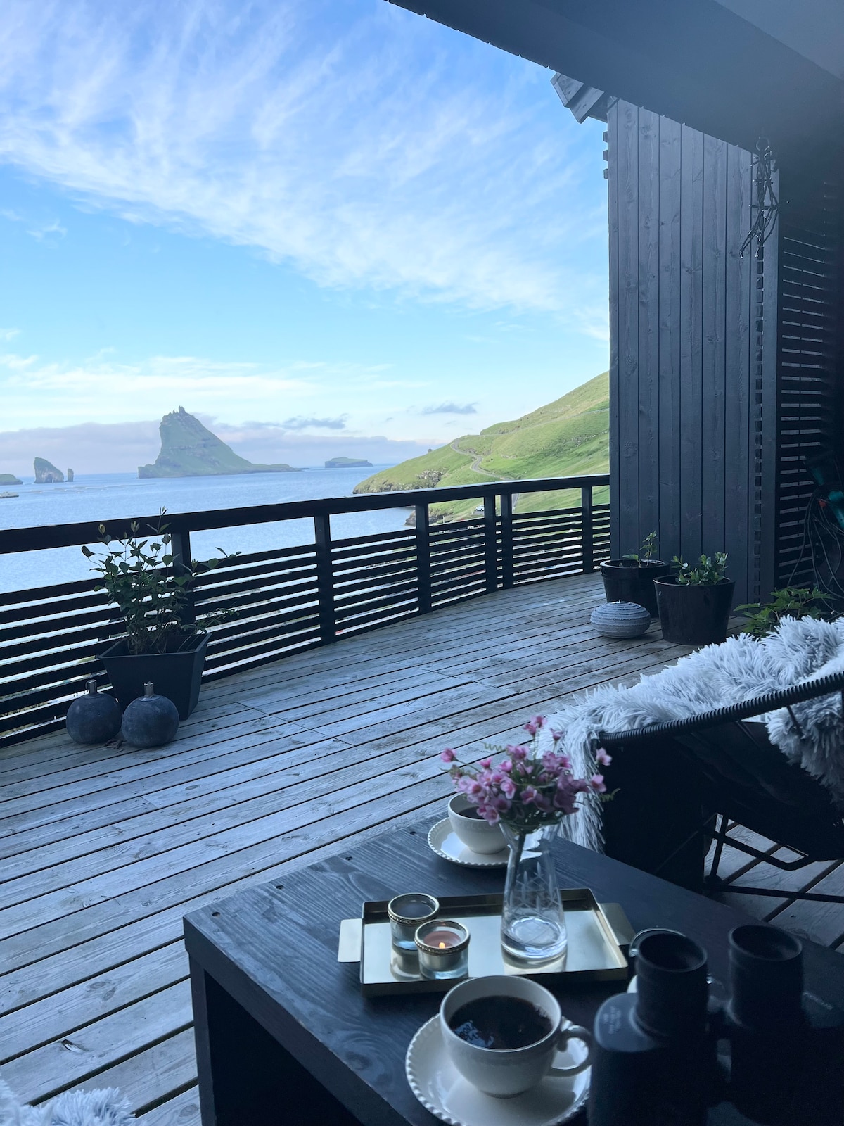You can enjoy uninterrupted views of the Atlantic Ocean, with Drangarnir and Tindhólmur rising dramatically from the sea. PanoramaView offers you a rare front-row experience. Panoramic windows and a private terrace invite you to slow down and fully absorb the ever-changing light and scenery. Thoughtfully designed for comfort and privacy, it feels secluded and calm, yet only 7 min from Vágar Airport - an ideal base for exploring Vágar at your own pace.