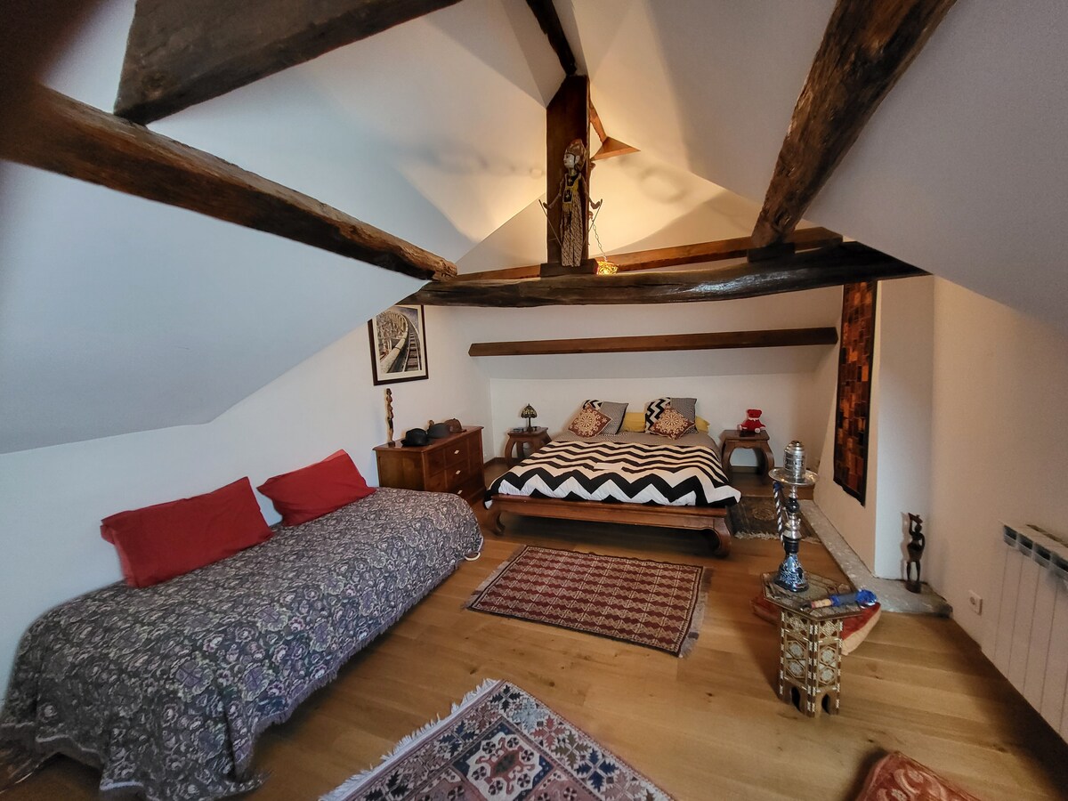Suite seluas 45m2 ini benar - benar pribadi terdiri dari kamar tidur dengan teras yang disediakan untuk tamu kami, kamar mandi yang sangat trendi dan ruang tamu yang indah dengan pemandangan taman. Tempat tidurnya berukuran 140×190 untuk 2 orang. Tempat tidur tambahan (lantai atas) harus diminta dan dikenakan biaya €25. Keranjang "sarapan" dengan roti segar dan selai akan diturunkan setiap pagi. Desa ini menawarkan semua fasilitas dan mengundang pariwisata regional. !! Tidak ada dapur kecil!!