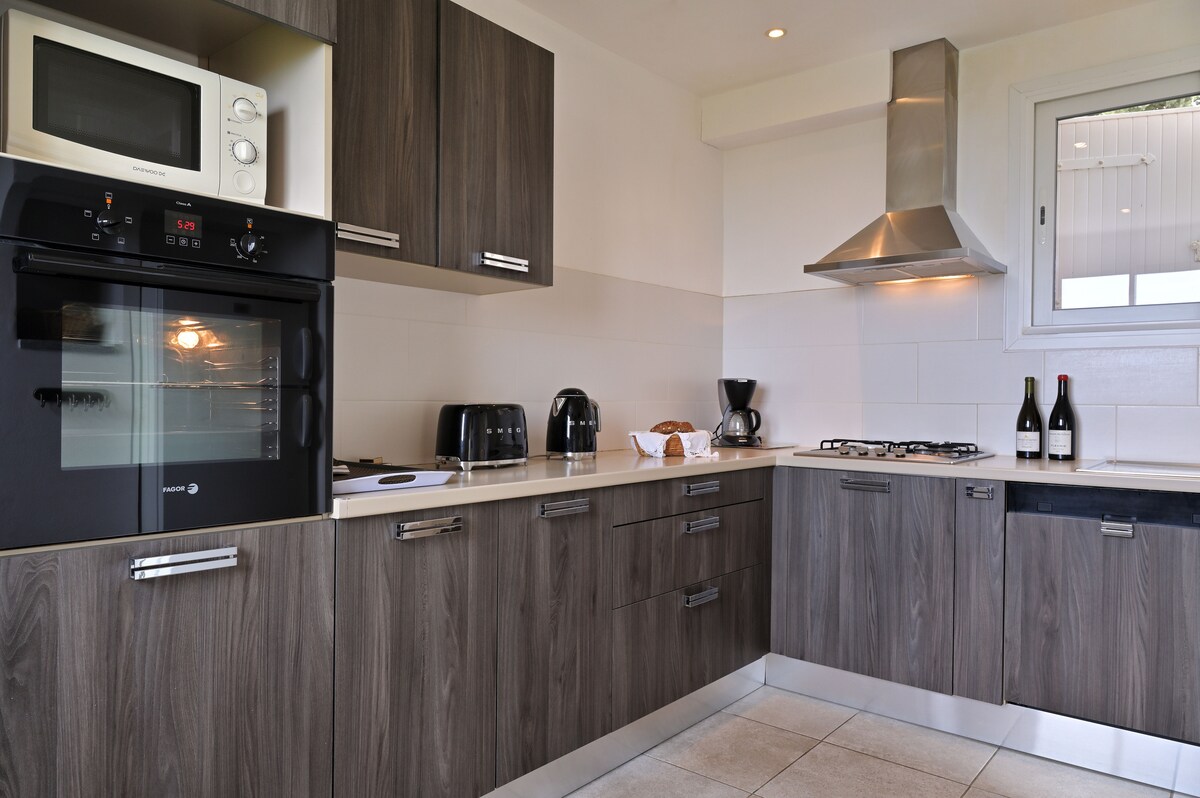 Villa JUWEN terdiri dari: * 2 kamar tidur cantik berukuran 12 meter persegi masing - masing dilengkapi TV. * 1 kamar mandi, 1 WC terpisah. * 1 dapur lengkap terbuka ke ruang tamu dengan sofa bed berkualitas sangat baik. Di luar Anda akan menemukan teras 70m² yang indah dengan furnitur taman untuk 6 orang, plancha dan 4 kursi berjemur. Kolam renang ini berukuran 6mx3m dan dipanaskan mulai April hingga Oktober.