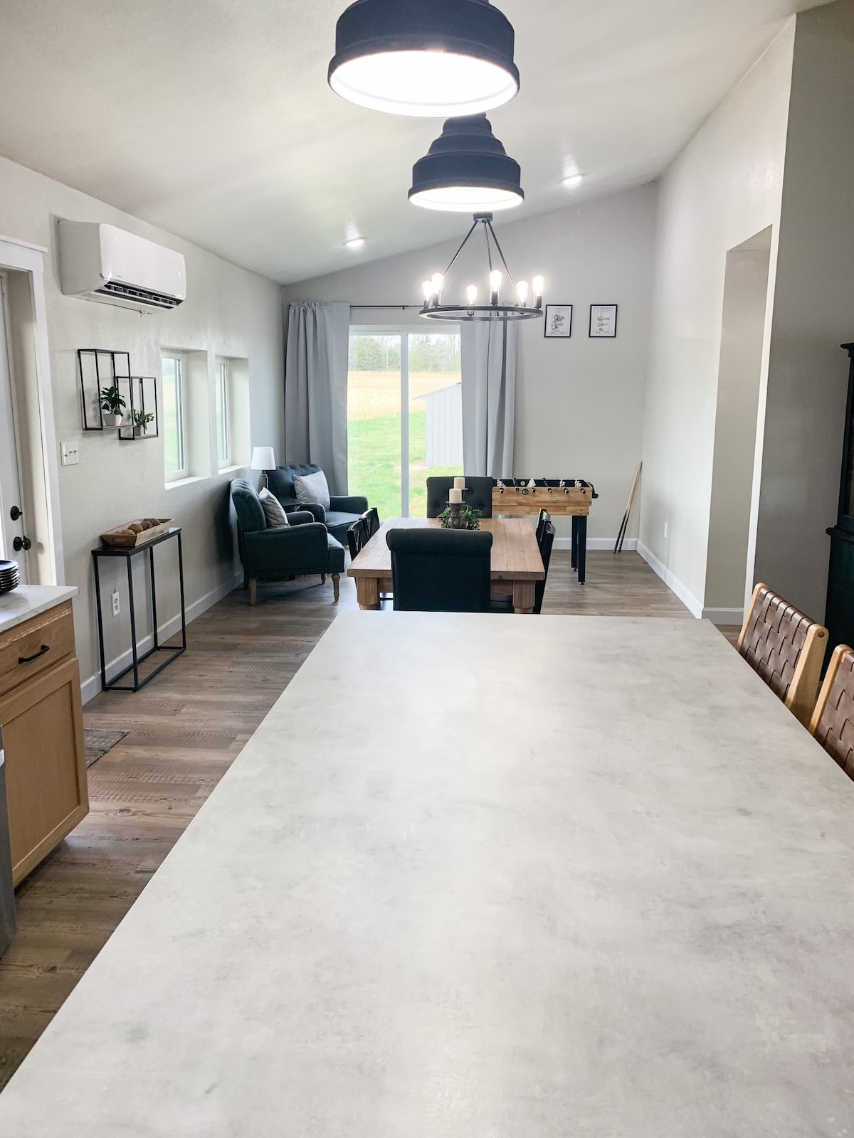A respite from hustles of the world. Escape to this fully renovated modern farmhouse, complete with a private fishing pond, fire pit, and spacious deck overlooking a wooded backdrop. Perfect for family getaways, romantic weekends, or a relaxing retreat in nature. Sleeps 4, with a cozy living area, fully stocked kitchen, and fun amenities like ping pong and outdoor games.