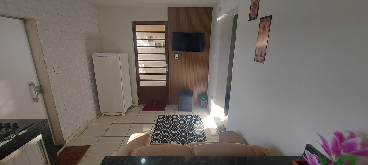 Micro casa com suíte, cozinha, garagem pra 1 carro médio (esse cômodo pode ser usado como quarto e separar a cama ou uma sala grande.) Pátio com lavanderia. Localização bem central Espaço único e independente com total segurança e liberdade. O espaço possui 1 cama de solteiro, 1 sofá cama casal e 1 berço retrátil. Acomoda até 3 adultos e 1 bebê . Também tem espaço pra um animal amigo. Internet 6G e mesa pra trabalho, tv , geladeira , microondas e fogão
