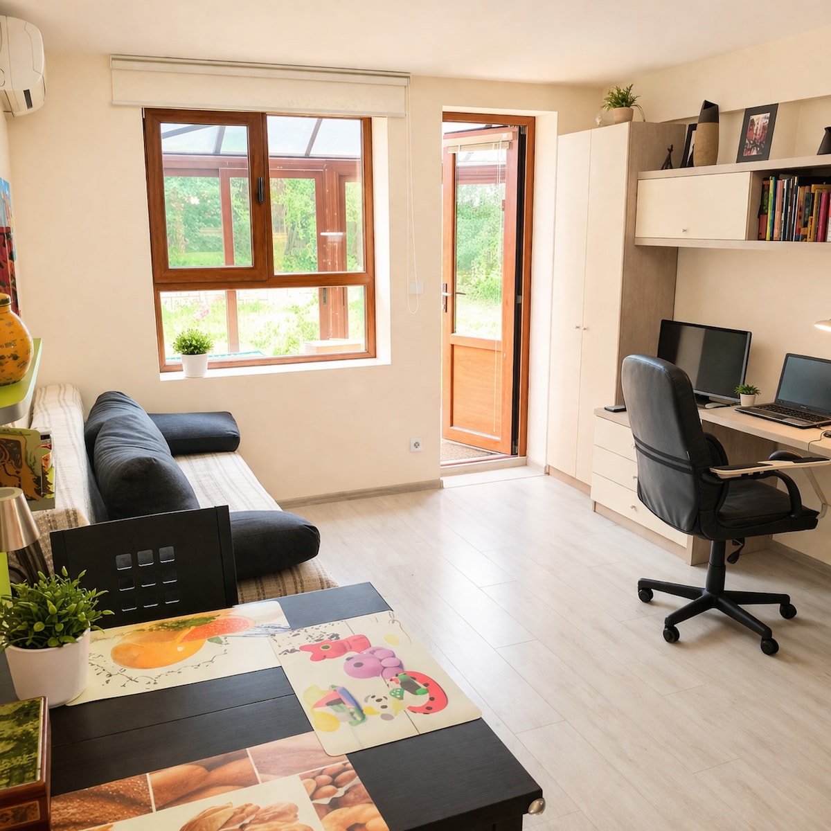 Apartemen nyaman yang menampilkan beranda tertutup kaca yang indah, cocok untuk kopi pagi, malam yang santai, atau bekerja dari jarak jauh dengan cahaya alami, hanya berjalan kaki sebentar dari Pantai Kabakum dan garis pantai Riviera. Nikmati akses gratis ke pantai, mata air mineral terdekat, kafe, dan restoran tepi laut. Tempat tidur yang nyaman, sofa lipat, wi-fi berkecepatan tinggi, 2 tempat kerja dengan kursi yang nyaman, dan dapur lengkap menjadikannya sempurna untuk masa inap santai, kerja jarak jauh, atau menjelajahi Varna dan Golden Sands.
