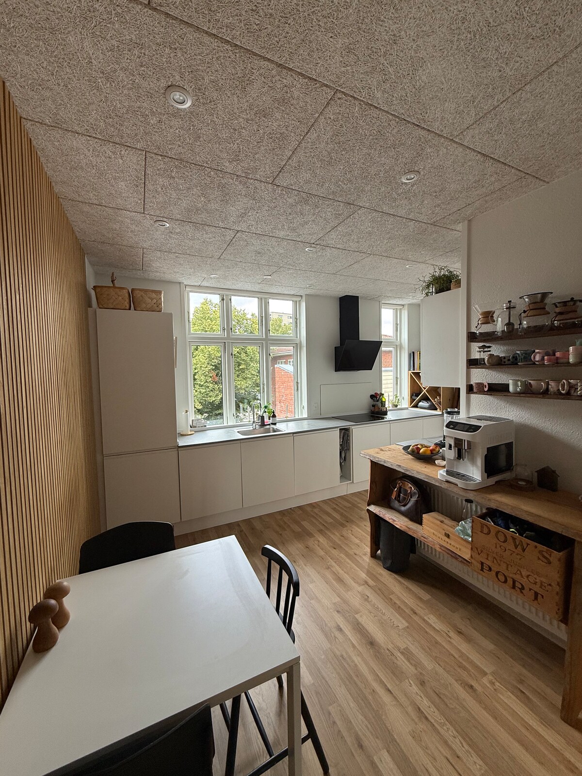 Enjoy stunning views of Kolding Fjord from this bright 110 m² first-floor apartment in a charming white patrician villa. Features 2 double bedrooms, a large bathroom, cozy living room, and a fully equipped kitchen-dining area with access to a private terrace with sun loungers. We live quietly on the ground floor and respect your privacy.