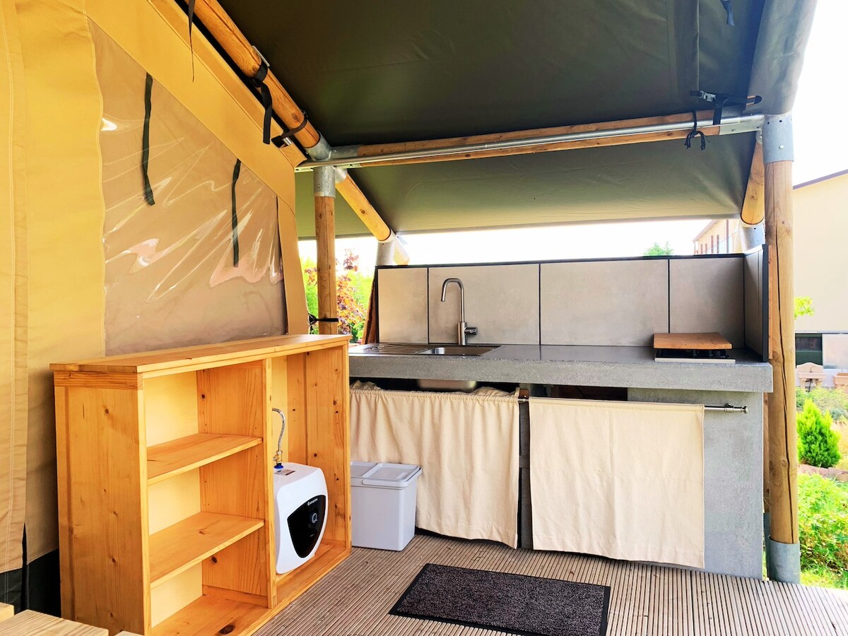 HANYA ORANG DEWASA Berhubung kembali dengan alam dengan penginapan yang tak terlupakan ini, di tenda glamping kami yang dikelilingi alam namun dilengkapi dengan baik untuk keperluan anda. Dapur kecil dengan induksi, ketel, mesin pembuat kopi dengan filter, AC, ruang luar ruangan dengan meja dan kursi pribadi, tempat tidur, lemari. Properti ini cocok untuk 2 orang. Kursi berjemur tersedia di kolam renang. Struktur kamar mandi dengan air panas, pengering rambut, deterjen. Kami menunggu Anda untuk masa inap yang tak terlupakan.