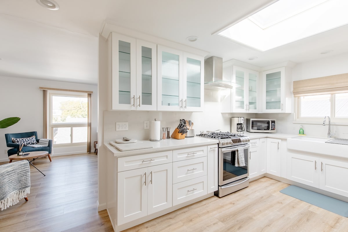California sunlight streams in through rows of vintage windows and illuminates white walls and vaulted ceiling of our bright beach bungalow. Modern and remodeled, the lovingly cared home is located in historic Venice. Exceptionally located 3 blocks from the beach, you will also find yourself half a block away to world famous Abbot Kinney restaurants, coffee shops, boutiques, and galleries from the comfort of a relaxed beach vibe home and copa d'oro garden. Much coveted private parking available.