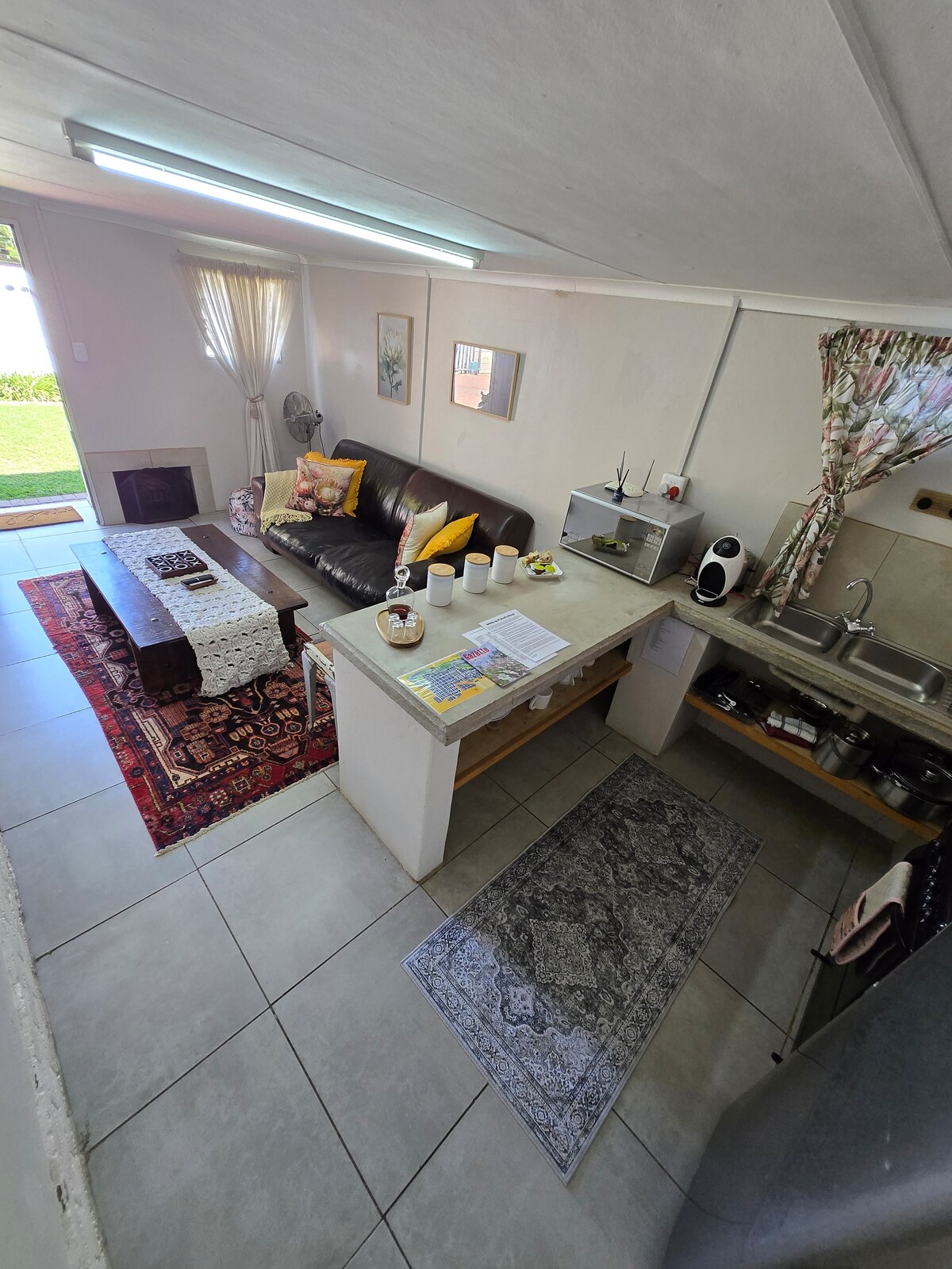 Unit self-catering yang dilengkapi perabotan luas dan memiliki kamar tidur dengan tempat tidur berukuran queen, kamar mandi dan ruang tamu terpisah dengan sofa, TV, dapur kecil. Sistem tenaga surya - tidak ada pemadaman listrik! Tempat tidur kemah tersedia dan tempat tidur single bisa disediakan atas permintaan dengan biaya tambahan. Semua fasilitas yang diperlukan untuk masa inap singkat. Lokasinya 400 m dari Afridome dan 2 km dari sungai/Breë Street, tempat Anda bisa menikmati kota kami yang indah dengan berbagai galeri, toko antik, dan restoran.