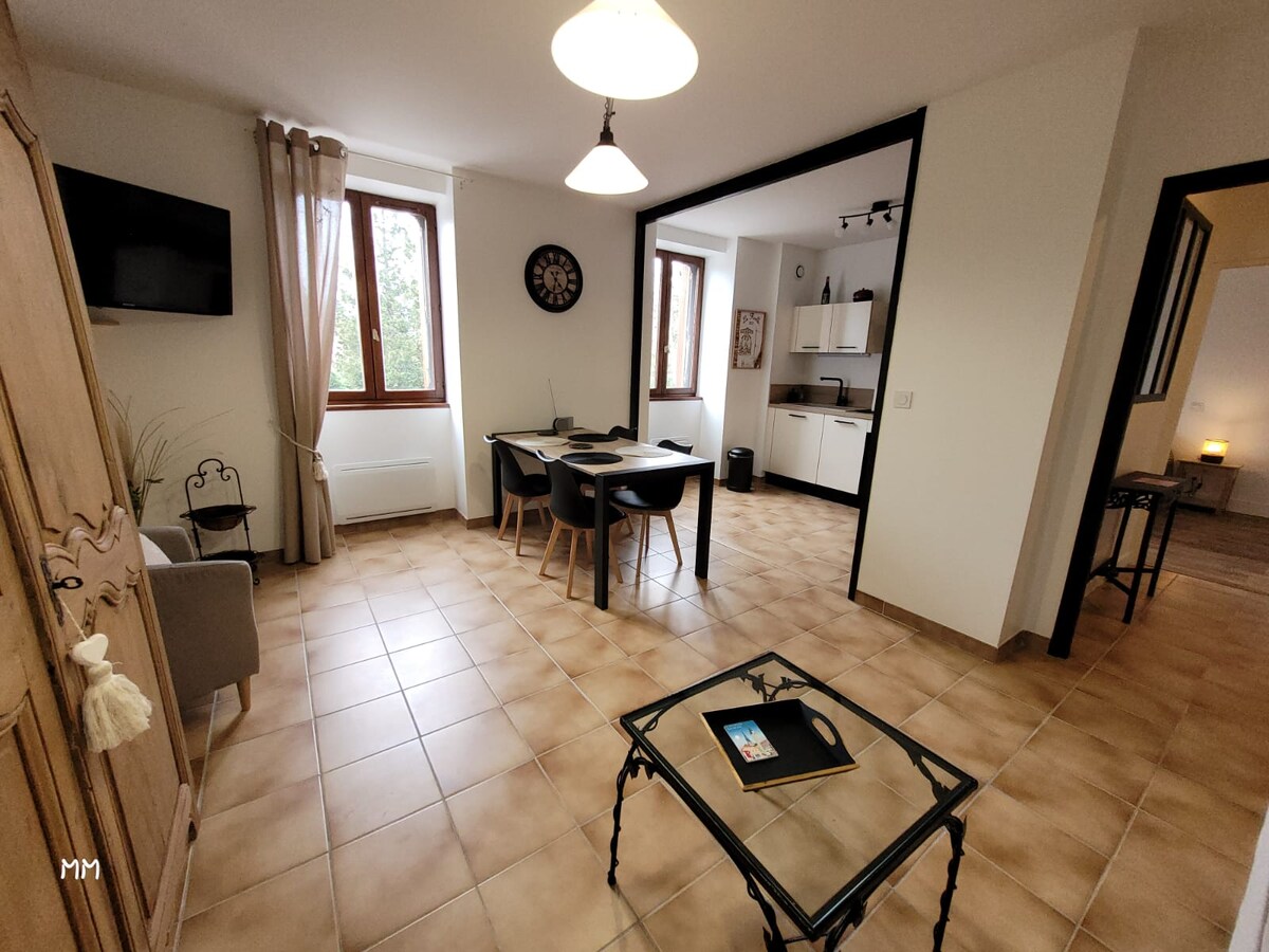 T2 besar yang terang (lantai 1), di dalam rumah keluarga kami, dengan akses jalan Anda sendiri. Rumah ini menghadap alun - alun teduh dengan meja dan bangku. 30 menit dari taman hiburan/kebun binatang pal, 30 menit dari Vichy dan 30 menit dari Moulins. Kepoksimitas langsung Val d 'Allier, zona Natura 2000 dan La Nationale 7. Kemungkinan untuk memarkir kendaraan yang sangat besar di depan rumah. Atas permintaan: kasur ekstra dan tempat tidur payung. makanan starter datar seharga € 6,70 mesin cuci € 4,50