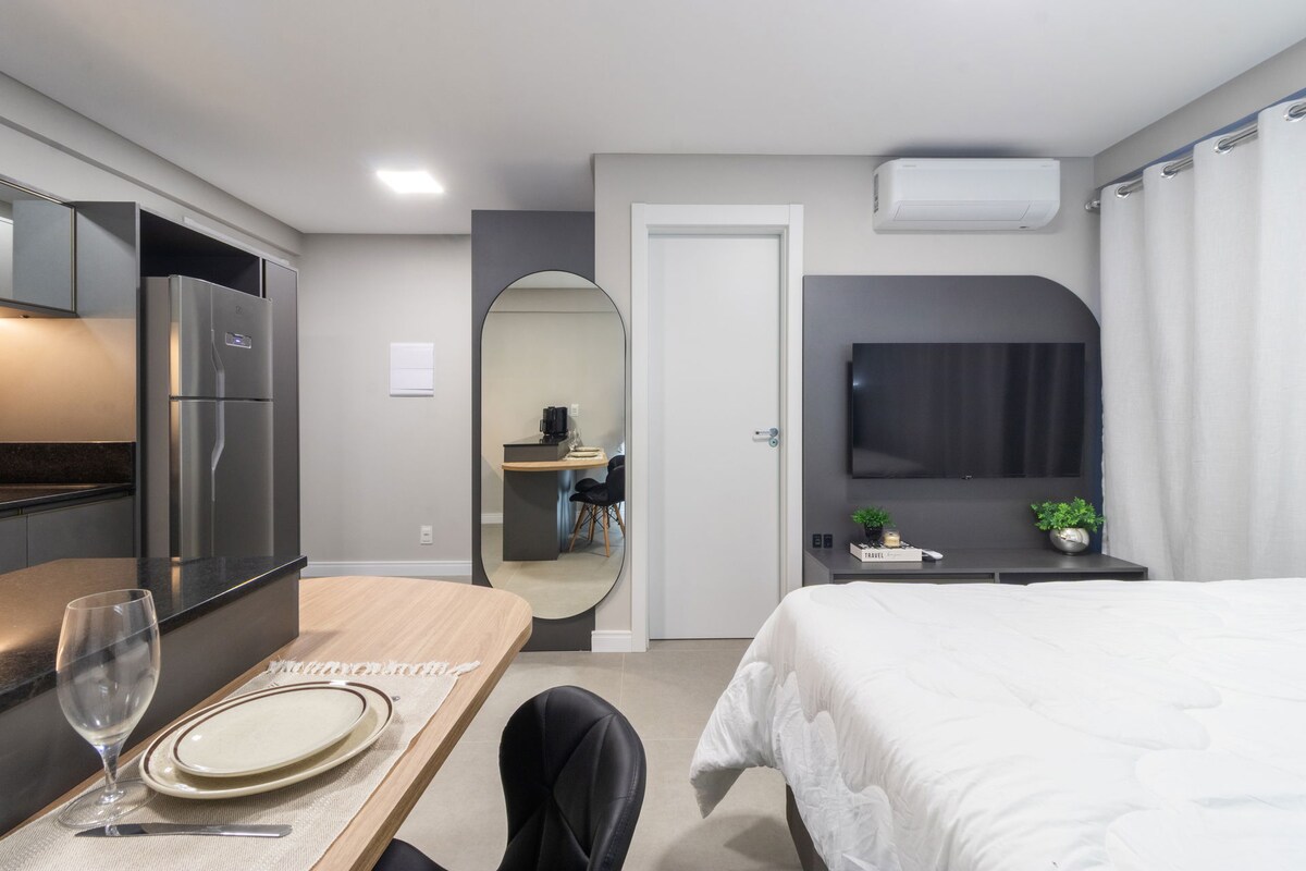 Compacto, indah dan modern, studio ini ideal bagi mereka yang mencari kenyamanan dan kepraktisan di Blumenau. Terletak hanya 5 menit berjalan kaki dari Vila Germânica dan 11 menit dari Taman Ramiro Ruediger, tempat ini memiliki gym, garasi, lift, dan akses tanpa tangga. Sempurna untuk pasangan atau wisatawan solo yang menghargai akomodasi baru, berdekorasi, dan lengkap di salah satu tempat terbaik di kota ini.