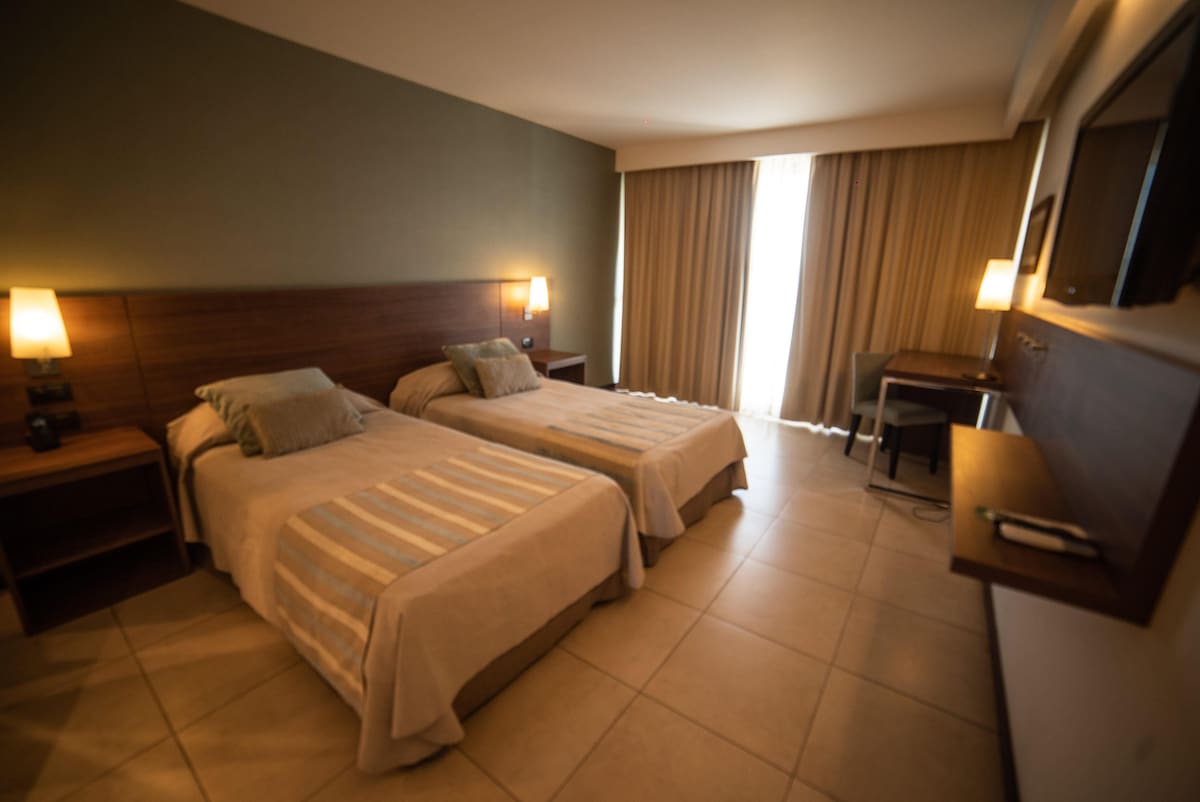 Departamento completamente equipado para dos personas en el hotel Amerian Carlos Paz. Se puede elegir entre una cama doble o dos simples, con living, cocina, comedor e impresionantes vistas panorámicas. Para una estadia completa, ofrecemos desayuno buffet americano, gimnasio, piscina con solárium y estacionamiento incluido en el precio de la tarifa. Contamos con recepcion 24hs.