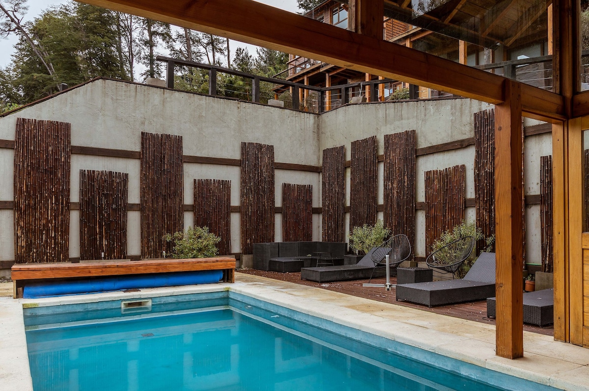 Pantai kabin bergaya pedesaan yang hangat dari Danau Nahuel Huapi dengan kolam pusaran air, rumah kayu bakar, dan dek. Satu kamar yang dibuat untuk relaksasi dan romansa dengan matahari terbit dan terbit bulan di atas danau. Smart TV dan internet SERAT OPTIC dengan wifi untuk pekerjaan. Dapur kecil dengan segala yang dibutuhkan, termasuk mesin pembuat kopi rasa manis. Kotak keselamatan untuk melindungi buku catatan Anda saat berjalan. Kamar mandi lengkap. Kolam renang, ping - pong. Pantai: Kayak dan dayung berdiri. Sarapan kontinental.