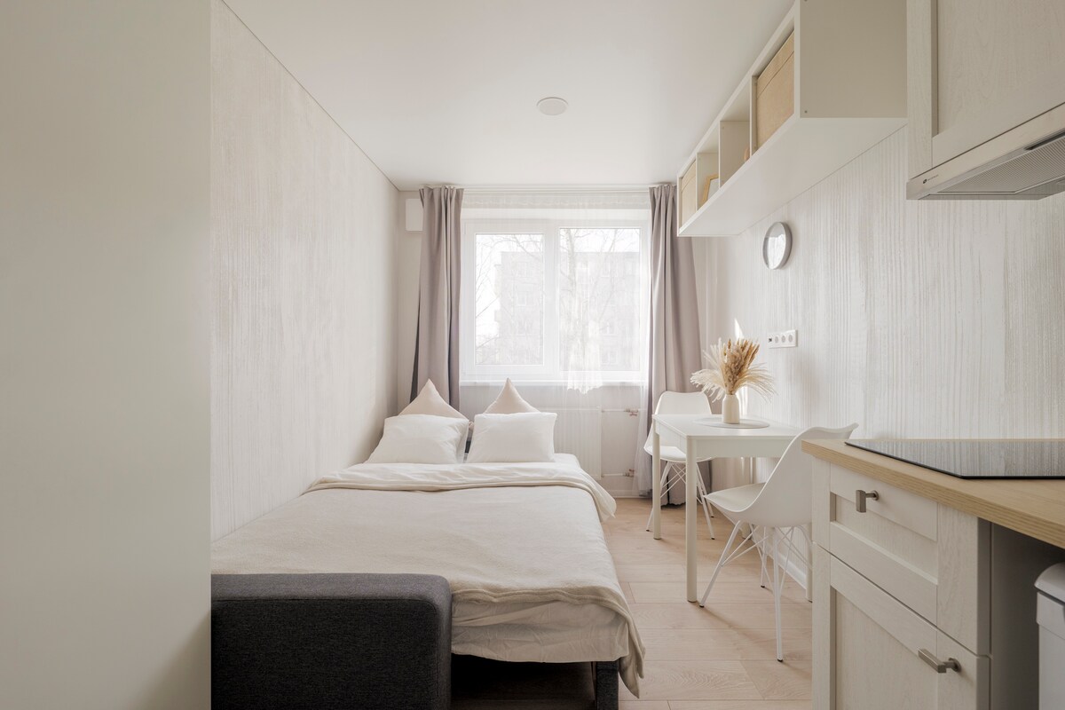 Studio seluas 26m² di Užupis ini berlokasi di lantai 1 dan sangat cocok untuk 2 orang atau wisatawan solo. Ada dapur lengkap dan mesin cuci/pengering 2 - in -1. Catatan: tinggi langit - langit mezzanine adalah 1,15m yang mungkin tidak nyaman untuk individu yang lebih tinggi. Studio menghadap jalan yang cukup sibuk namun tenang di malam hari. Pintu masuk langsung dari jalan. Parkir gratis! Hewan peliharaan dipersilakan!