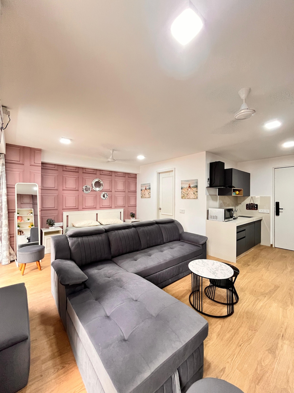 Masuklah ke 404 Luxe Haven, apartemen studio seluas 404 kaki persegi yang dirancang dengan cermat yang memadukan kenyamanan modern, pencahayaan hangat, dan interior elegan. Menampilkan sofa beludru mustard khas, tempat tidur queen nyaman yang dibingkai dengan lampu latar bunga, dapur modular yang bergaya, dan balkon santai dengan tanaman hijau, tempat ini cocok untuk lajang, pasangan, atau pelawat bisnis. Nikmati suasana damai dengan dekorasi kontemporer, nada netral lembut, dan setiap hal penting yang dipilih untuk masa inap yang lancar.