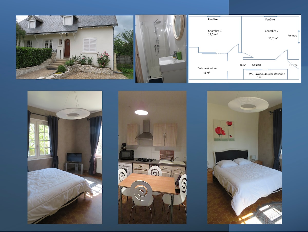 Terletak di distrik bersejarah pusat kota BLOIS, 3 menit berjalan kaki dari Châteaux, 20 menit dari Chateau de Chambord. 45 km dari Beauval Park. Dapur yang dilengkapi, mesin cuci piring, pembuat kopi Senseo, oven, kompor induksi, mesin cuci, dll.. tempat tidur sofa wifi. Kamar besar dengan perlengkapan tempat tidur yang nyaman Area parkir pribadi kecil tertutup. Taman pribadi. Seprai akan dibuat untuk kedatangan Anda. handuk, Shampoo, hair dryer shower gel dll.. tersedia. Kemungkinan besar Anda akan menikmatinya.