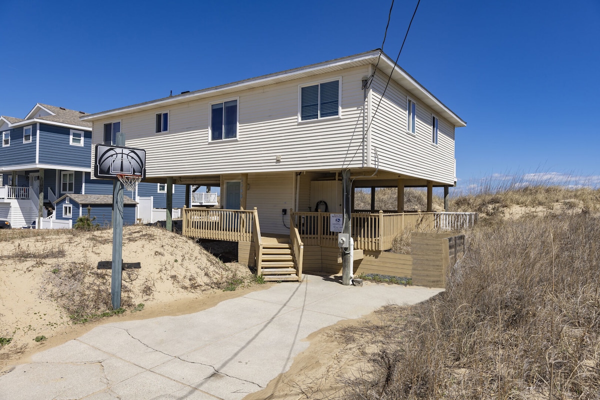 Rumah Semi Ocean front 4 kamar tidur dengan banyak pemandangan pantai dan laut. Pemandangan laut dari kamar yang bagus, 2 kamar tidur depan dan dek besar. Pembaruan di luar rumah dan dapur. Seprai dan handuk segar untuk setiap masa inap. Dek besar baru untuk hiburan dan pemanggangan. Pancuran luar, perapian dengan kursi Adirondack, hammock, ring basket, gerobak pantai dengan 4 kursi pantai dan payung. Set Cornhole. Pantai berada di seberang jalan atau 1 menit berjalan kaki. Parkir untuk 6 mobil. Dilarang merokok dan dilarang membawa hewan peliharaan.