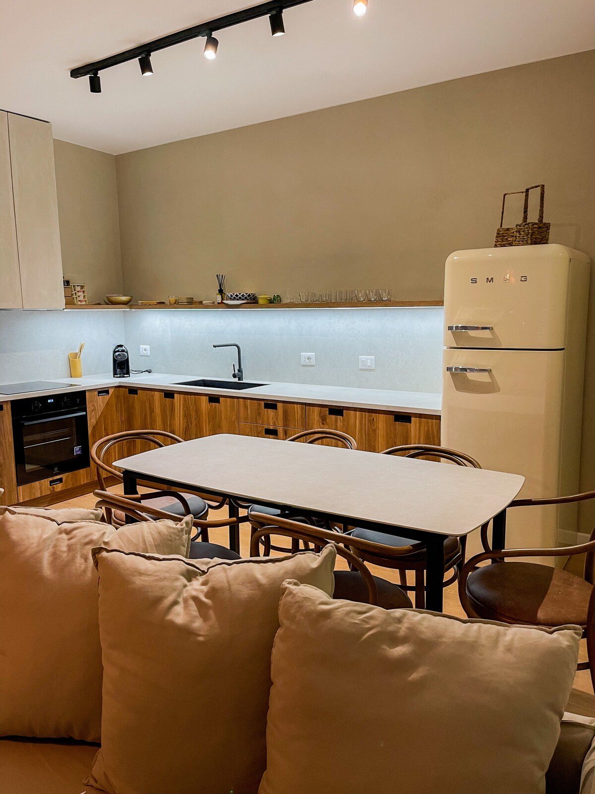 Apartemen lantai atas dengan ruang tamu besar, dapur lengkap dengan 2 kamar tidur dan satu toilet. Udara - kondisi untuk semua kamar dan ruang tamu. Mesin Cuci di apartemen. Balkon besar dengan meja makan dan pemandangan indah ke laut disediakan untuk tamu kami. Lemari besar di semua kamar. Parkir aman gratis. Dapat menampung hingga 6 tamu