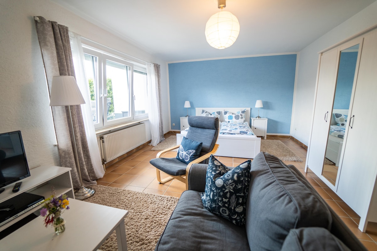 Apartemen bawah tanah yang indah di rumah terpisah langsung di Rhine (3 menit berjalan kaki), feri ke Rheingau. Parkir gratis. 26 meter persegi, tempat tidur double (1,8x2m), tempat tidur sofa, lemari pakaian, pancuran/WC. Handuk, seprai. Dapur kecil dengan wastafel, piring induksi, microwave, kulkas, mesin kopi, pemanggang roti, ketel, piring. Tersedia kopi dan teh. WIFI dan televisi; penerimaan ponsel terbatas. Lokasi yang tenang, tidak melalui lalu lintas, di cagar alam "Jungaue ".