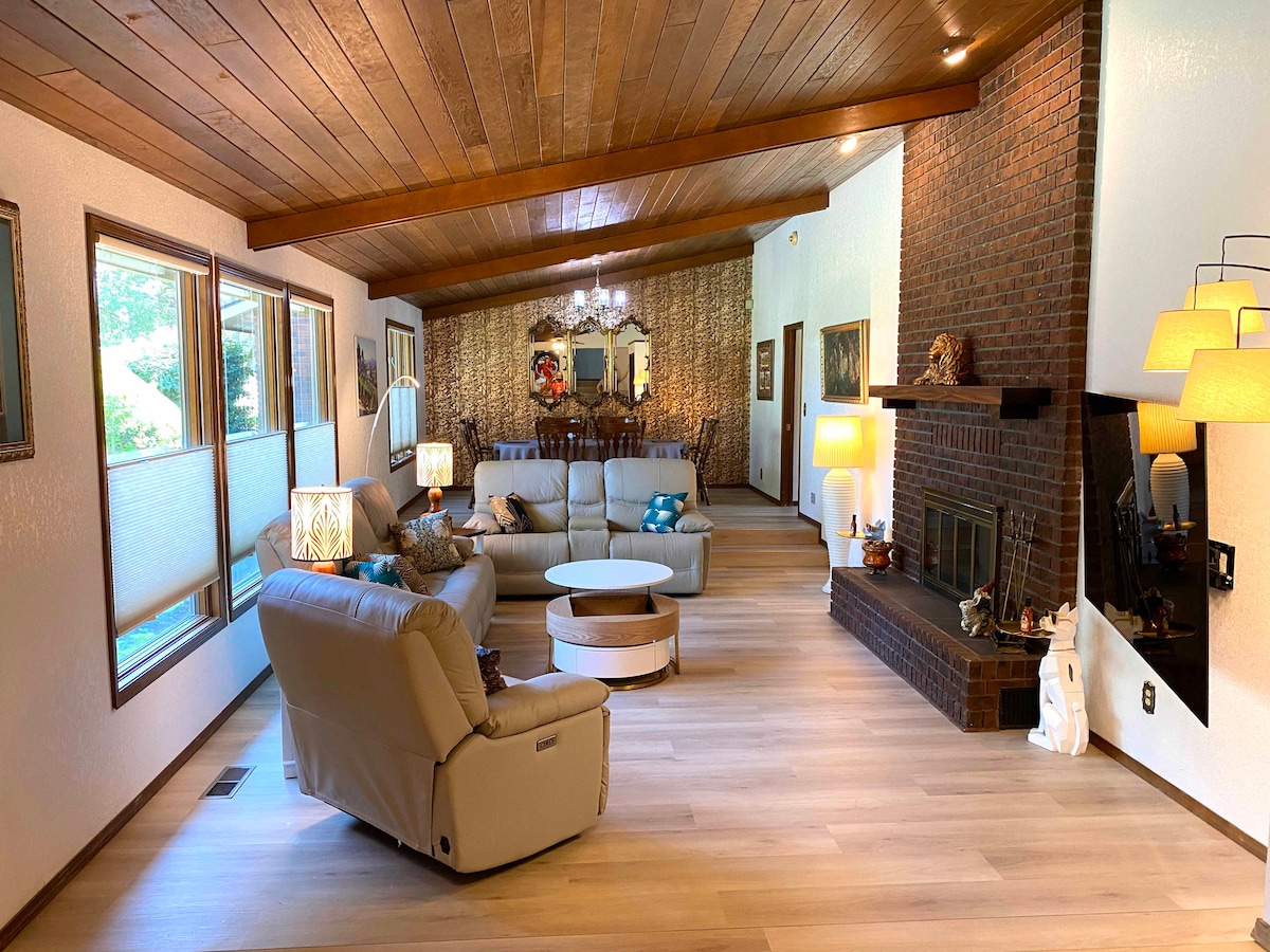 Bright and spacious Loft with open Living/Dining and Kitchen area. Large, comfy couches positioned in front of a warm and cozy gas fireplace and Smart TV. Prep a meal in the spacious kitchen with all new appliances and cabinets. All new dishes, cookware and utensils. Enjoy coffee on the patio from a Keurig. There are 2 Bedrooms with Queen size beds and an open Loft area at the top of the spiral staircase with a Queen bed as well. Great place to enjoy family and friends.