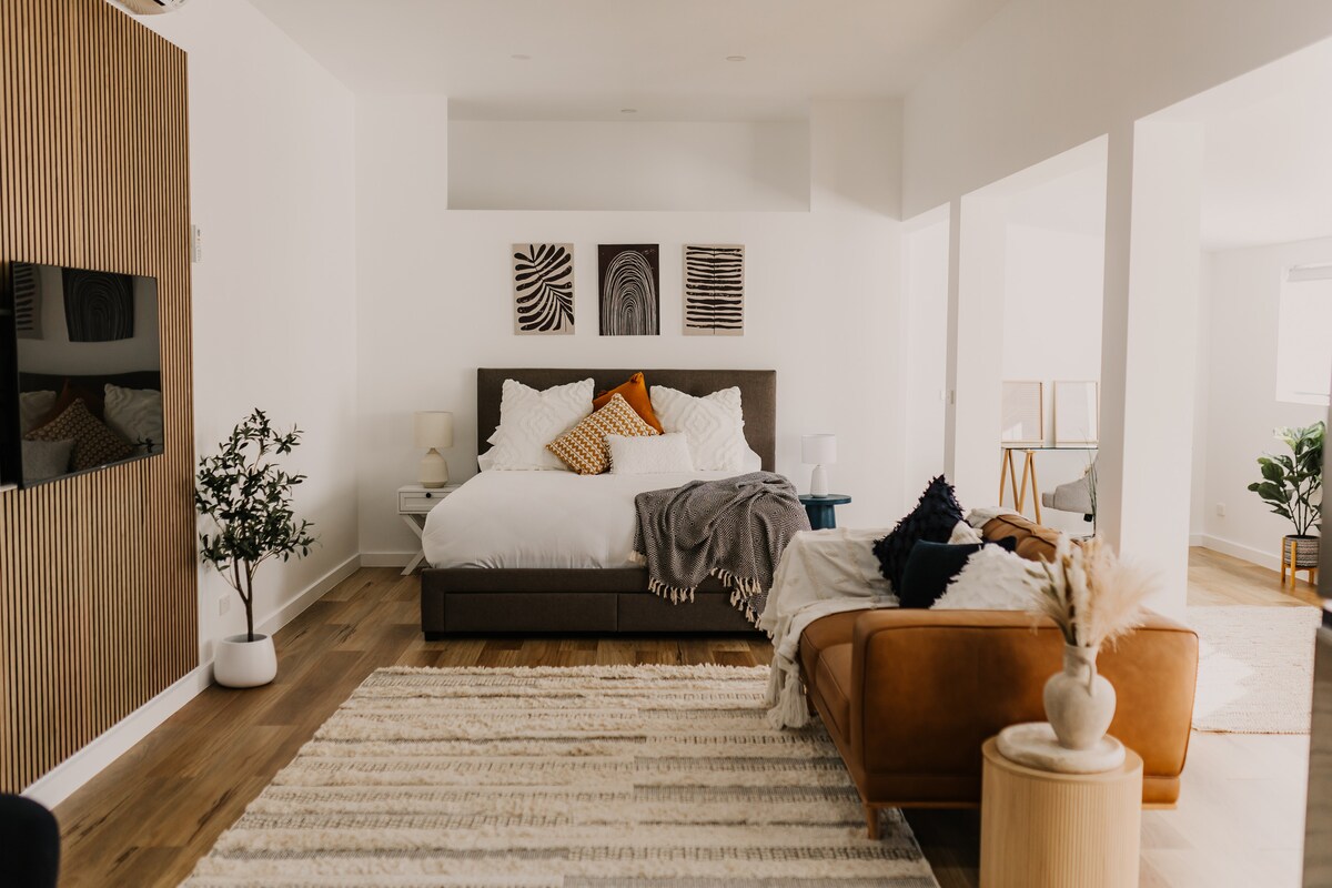 Step into a cozy studio apartment featuring modern decor and functional elegance. A king bed with crisp linens stands beside a sleek kitchenette with stainless steel appliances. Across from the bed, an office desk bathed in natural light offers a productive workspace. Double doors lead to a private outdoor patio, adorned with modern furniture and lush greenery. Neutral tones and thoughtful design create a serene retreat in any setting