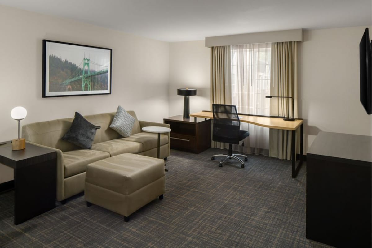 Stay near the best of Hillsboro at Residence Inn Portland Hillsboro, just 1 mile from The Streets of Tanasbourne for shopping and dining, 3 miles from Gordon Faber Recreation Complex, and 10 minutes to Topgolf. Each suite has a full kitchen with an oven, free Wi-Fi, and a 55” TV. Enjoy free hot breakfast, a heated outdoor pool, a sports court, and a BBQ area. Downtown Portland is only 15 minutes away, making this the perfect spot for work trips, weekend getaways, or extended stays.