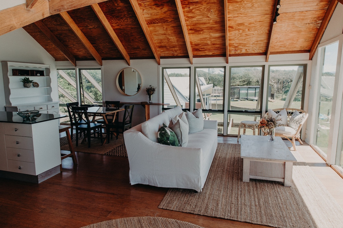 Pondok putih kecil bertengger di puncak bukit tertinggi Byron Hinterland. Mengundang tempat peristirahatan solo atau romantis Anda berikutnya, sangat tenggelam dalam keindahan dan keheningan alam. Rasakan matahari terbit yang paling indah dari tempat tidur dengan secangkir teh, matahari terbenam dari beranda dan laut 360 derajat hingga pemandangan gunung. Pondok kami lengkap sehingga Anda tidak perlu pergi, tetapi jika Anda harus... Byron Bay hanya berjarak 10 menit berkendara dan Bangalow, 5 menit. Ramah Hewan Peliharaan (atas persetujuan)