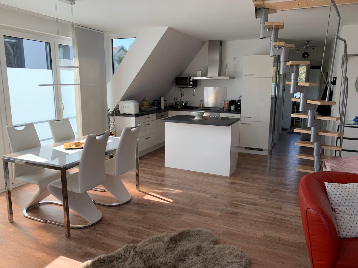 Check in/out mandiri 24 jam, akomodasi nyaman (lantai 1 dan DG, akses terpisah), tenang, ruang tamu/ dapur berukuran 48 meter persegi - kamar tidur dengan sofa + tempat tidur ganda, perapian, dapur terbuka besar yang dilengkapi lengkap. Dapur, kamar mandi dengan pancuran + bak mandi, meja makan dengan 4 kursi, lemari pakaian, TV+Amazon Alexa, lantai runcing dengan tangga spiral 2 tempat tidur atau bersama 1 double bed balcony + parkir, 7 sepeda & 2 cityroller 350m - Aasee, 230m baker , 550m - gr. Supermarket. 3 km - Kota, jalan raya 400 m, halte bus 15 m + 200 m, Kota+Uni: 12 menit dengan sepeda / bus