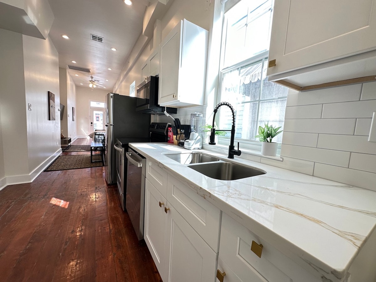 Baru saja direnovasi, bersih, dan cerah, dengan kamar mandi lengkap untuk setiap kamar tidur! Nikmati halaman belakang yang luas dengan sistem lampu otomatis pada malam hari untuk bersantai. Stasiun kerja triple monitor dengan keyboard dan mouse jika Anda perlu boot di jalan -- cukup bawa laptop dan pusat Anda. TV 4k 65"untuk menonton Netflix dengan Super Nintendo! Parkir di luar jalan. Dapur dan kedai kopi yang lengkap untuk memulai hari Anda dengan benar. Pemilik yang penuh perhatian yang mewajibkan tamu menikmati waktunya di New Orleans :)