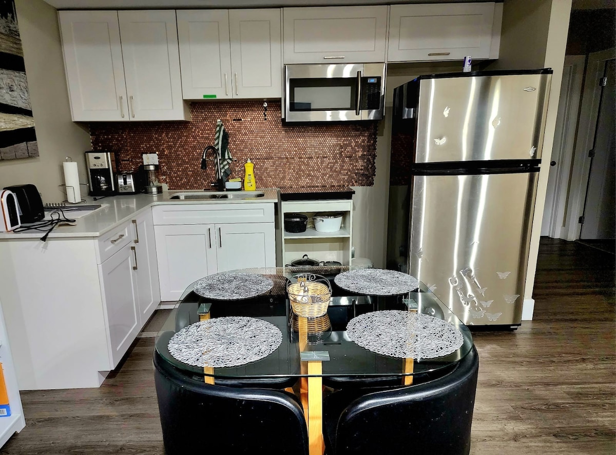 🏡 Fitur Utama ✔️ Suite basement legal yang cerah dan bersih ✔️ 2 kamar tidur dengan tempat tidur queen & seprai bergaya hotel ✔️ Futon bergaya Jepang hanya untuk tamu ke-5 – penggunaan ekstra atas permintaan ✔️ Dapur dengan pembuat kopi Keurig susu ✔️ Ruang tamu yang nyaman dengan Smart TV 58" ✔️Kursi gantung dalam ruangan yang bergaya Pintu masuk✔️ pribadi & check-in mandiri yang mudah ✔️ Parkir gratis di jalan atau tempat parkir 📍 Di sekitar properti ✔️ 2 menit berkendara ke pusat perbelanjaan ✔️ 15 menit berkendara ke Rabbit Hill Ski Resort ✔️ 20 menit berkendara ke YEG ✔️ 20 menit berkendara ke WEM