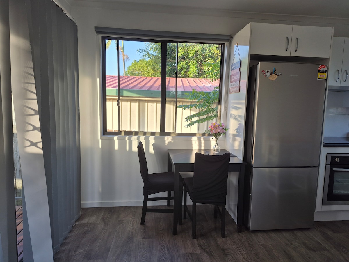 A self contained 1 bedroom unit at the front of our family home, in a residential cul-de-sac. Our unit has a full kitchen with oven, dishwasher and refrigerator. There is a modern bathroom with walk in shower, washing machine & dryer. 1 x King size bed (or 2 x singles - $30 fee) 1.2 km's to nearest supermarket & train station, which takes you straight to Brisbane City. 30 minutes to Redcliffe, Glass House Mountains, Bribie Island & Australia Zoo. Private outdoor area. Free parking for 2 cars