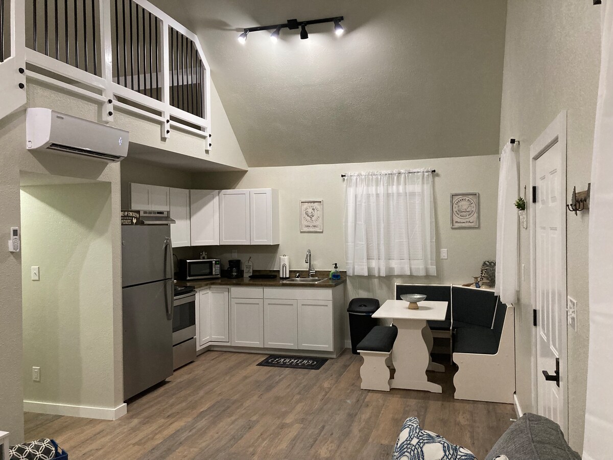 Parkir pribadi dengan jembatan berjalan kaki 30 kaki yang menghadap ke aliran air untuk membawa Anda ke pondok. Kamar tidur queen di lantai bawah; tangga spiral membawa Anda ke kamar tidur queen loteng Anda; satu kamar mandi lengkap; dapur lengkap; TV/WIFI; tempat tidur gantung loteng dalam ruangan; mengelilingi teras tertutup; area pancuran luar ruangan tertutup pohon dengan bak mandi air panas; teras belakang makan tertutup. Area perapian besar dengan kayu bakar kering. Tempat tidur gantung besar berukuran 12 kaki x 12 kaki di samping perapian. Pemanggang arang Park Series di luar.