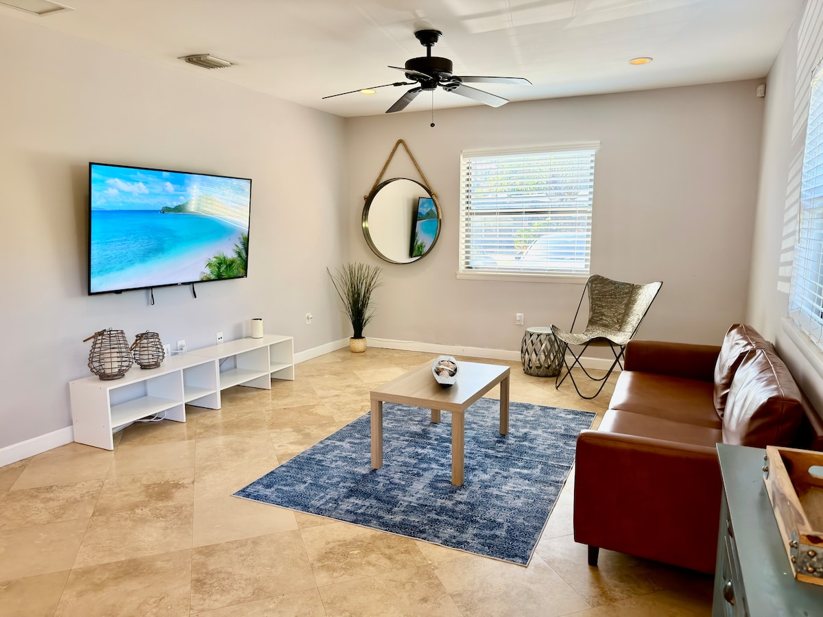 Selamat datang di oasis 2BR 2Bath kami yang cerah, terletak di pusat Wilton Manors, hanya beberapa menit dari pantai yang cerah. Surga zen ini memadukan desain berwarna - warni dengan daftar fasilitas yang kaya, cocok untuk liburan impian Anda. Nikmati kamar tidur King yang luas, ruang tamu terbuka, dapur lengkap, taman Zen yang tenang dengan bak mandi air panas pribadi, dan kolam renang berpemanas baru. Tetap terhubung dengan Wi - Fi berkecepatan tinggi, bersantai dengan Smart TV, dan nikmati parkir gratis. Pesan sekarang untuk pengalaman yang tak terlupakan!