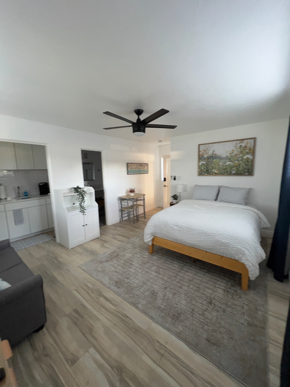 Bungalo pantai menyambut Anda ke Florida. Eksteriornya biru akan memberi tahu Anda bahwa Anda berada di tempat yang tepat. Suite pantai Anda ada di bagian belakang rumah kami, sudah tua sehingga dindingnya bisa tipis. Tempat ini memiliki semua yang Anda butuhkan untuk liburan akhir pekan termasuk kulkas mini dan microwave. Tempat ini memiliki kenyamanan yang ditemukan di hotel dengan semua karakter menginap di bungalo Floridian tahun 1920 - an. Ada meja dan kursi untuk bekerja dari jarak jauh, sofa untuk bersantai, tempat tidur king size, dan patio tertutup layar