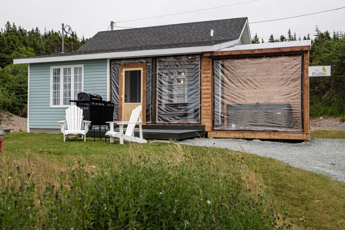 Located in Bay Roberts this secluded coastal cottage is a new build that offers rustic charm with a modern twist along with a beautiful ocean view. It has 2 bedrooms, 1 bathroom, 2 communal areas, and a well equipped kitchen. It also has TV/Internet and a mini split. Outside you can enjoy the comfort of a six- person hot tub, a koi pond, and berry picking in the summer and fall. The covered patio allows for all season use. Ideal for families and friends getting together.