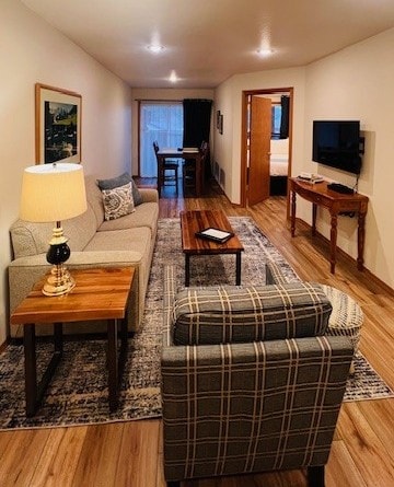 Lihat pemandangan pusat kota Leavenworth dari balkon Dream Suites 3 atau 4 pribadi Anda. Setiap apartemen adalah suite satu kamar tidur dengan tempat tidur king, sofa tarik, dan dapur lengkap (tanpa oven). Bersantai di ruang tamu/ruang makan yang luas dengan perapian listrik, atau berendam di bak mandi Jacuzzi kamar mandi (pancuran terpisah). Apartemen ini bisa menampung empat orang. Tarif didasarkan pada hunian ganda, dengan biaya ekstra per tamu tambahan 12 dan lebih. Apartemen ini berada di lantai tiga dan hanya bisa diakses melalui tangga.