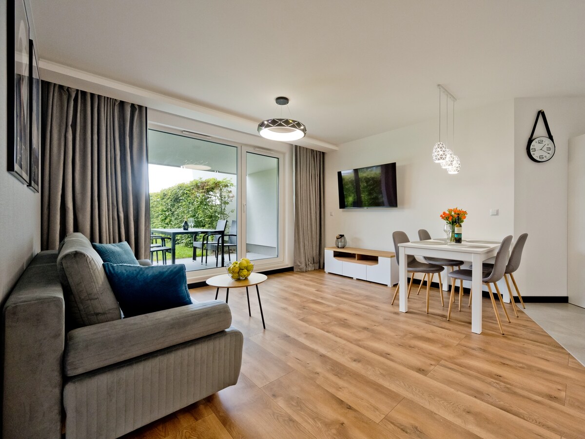 APARTEMEN RIWIERA 3 kamar dengan TERAS DAN KEBUN (lantai dasar) adalah apartemen baru, nyaman dan lengkap untuk 6+1 orang dengan luas 53m2. Apartemen ini terletak di pusat kota Władysławowo di ul. Rybacka 5, 300 m dari pintu masuk pantai. Apartemen ini terdiri dari ruang tamu dengan dapur kecil, 2 kamar tidur dan kamar mandi. Selain itu, ada tempat di garasi yang tersedia untuk Anda. TAMAN BERMAIN untuk anak-anak berjarak 20m dari apartemen.