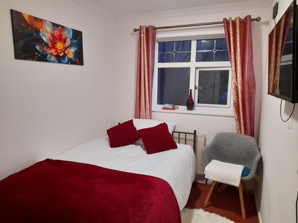“Mini Flat” dengan akses pribadi sepenuhnya dan ruang luar yang kecil. - Dapur kecil dengan wastafel, kompor, microwave, dan kulkas - TV - tempat tidur DOUBLE KECIL (4 kaki) - Shower, toilet, dan wastafel - Parkir. SANGAT tenang; danau di kedua ujung jalan. Pusat desa berjalan kaki singkat dengan pub, supermarket, kafe, dan toko keripik. Halte bus berada di ujung jalan memberikan akses cepat ke Pusat Kota. Harap perhatikan ukuran tempat tidur (1 x double kecil) dan memiliki 1 kamar mandi pribadi, bukan 1,5!